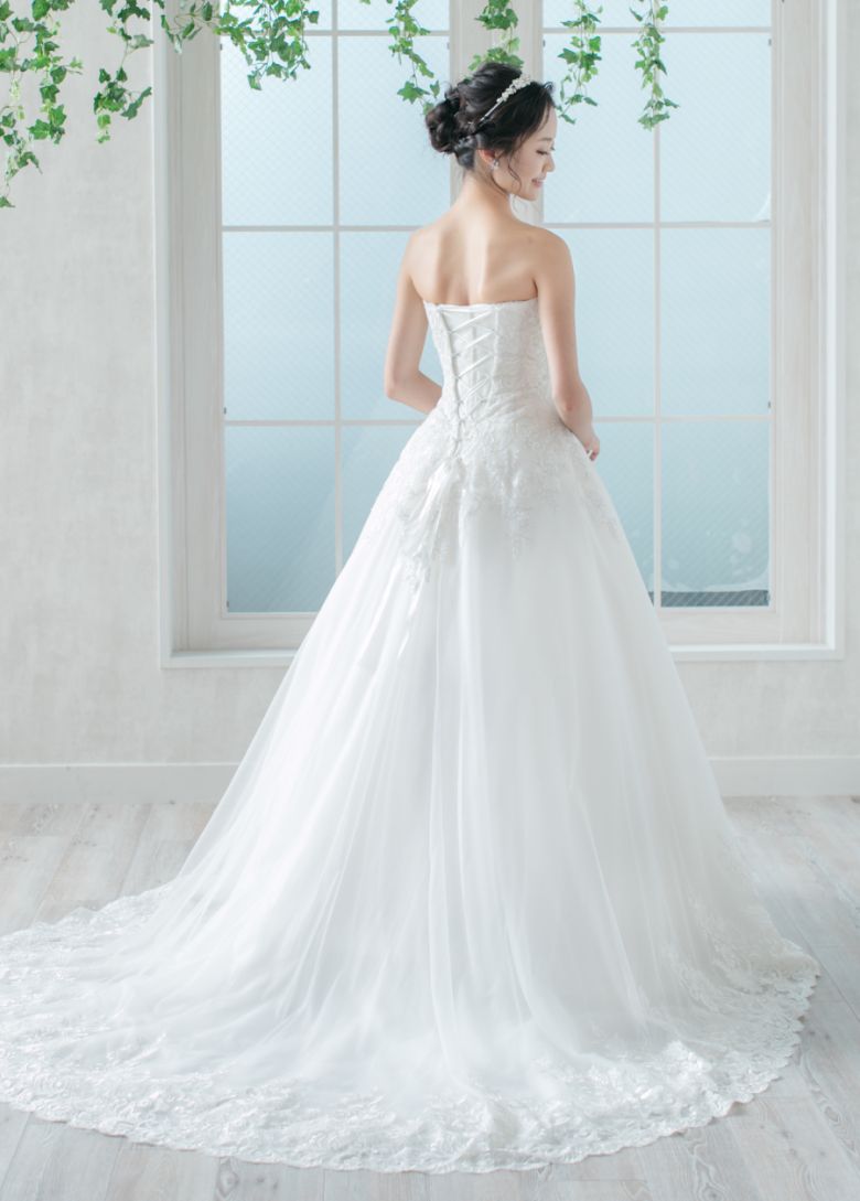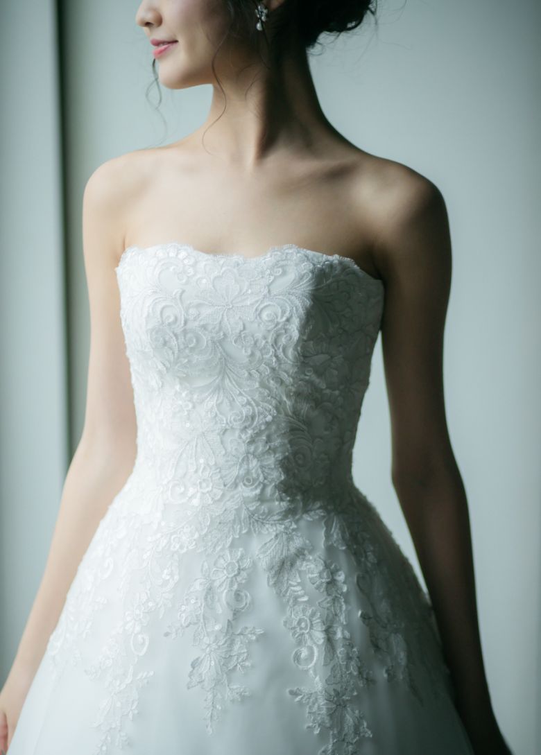 エンブロイダリーレースをふんだんにあしらったAラインドレスはいつの時代も人気トップクラス。キュッとまったウエストからゆるやかに広がるスカートは女性らしい曲線美をこの上なく演出してくれる1着。