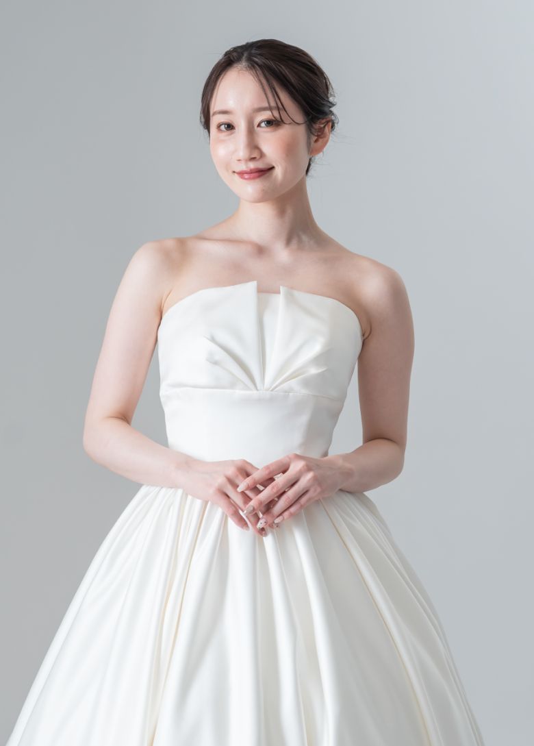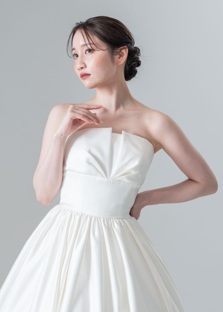 アイボリーカラーのAラインドレス。シンプルなデザインだからこそ、シルエットの美しさと光沢のあるサテン生地が活かされる上品な印象のドレス。ドレープにこだわったバックリボンがキュートさをプラス。取り外しも可能。