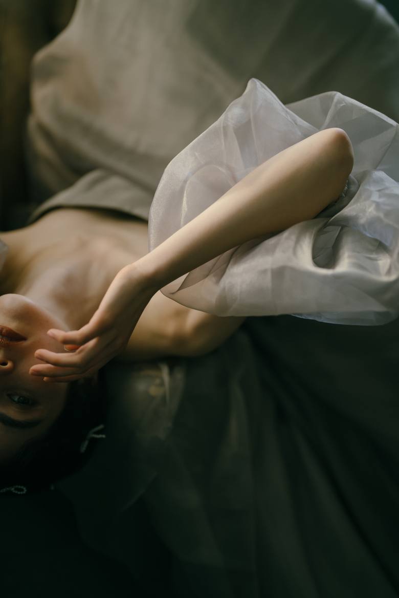 シンプルなデザインはシルエットが際立つため、特にバストラインの美しさや縫製など細部に渡ってこだわりました。絶妙なラインのハートネックは首を長くみせつつデコルテラインを綺麗に見せてくれます。シャンブレーオーガンジーのみで仕上げる事でニュアンスカラーが引き立ち、洗練されたシルエットがより強調されます。ブラウンのベルベットリボンでさりげなくウエストマーク。付属のボリュームパフスリーブは取り外し可能、シアー感のあるオーガンジーなので、気になる部分をカバーしながら軽やかなコーデをお楽しみいただけます。青みがかったゴールドベージュのため、全体的にお肌をトーンアップして見せてくれます。また、ゴールドだけではなくシルバー系のアクセサリーを合わせるのもおすすめです。