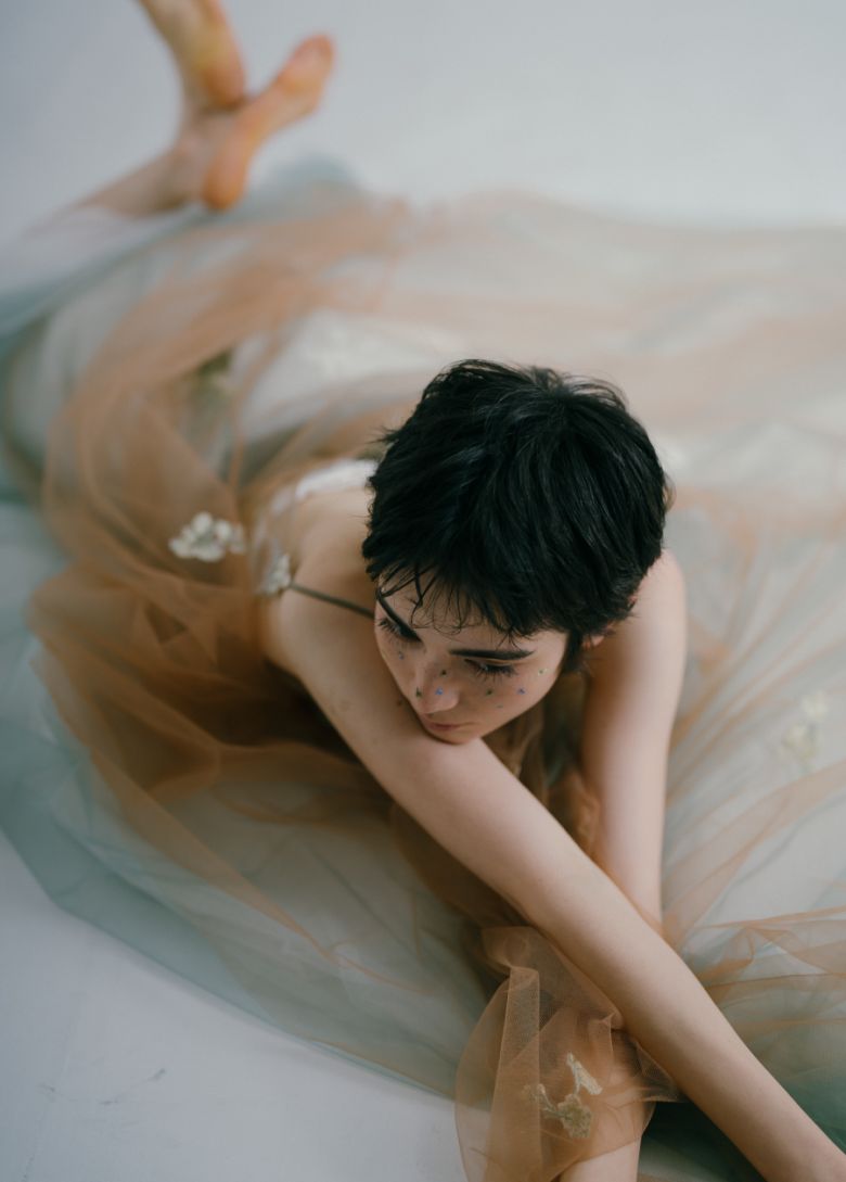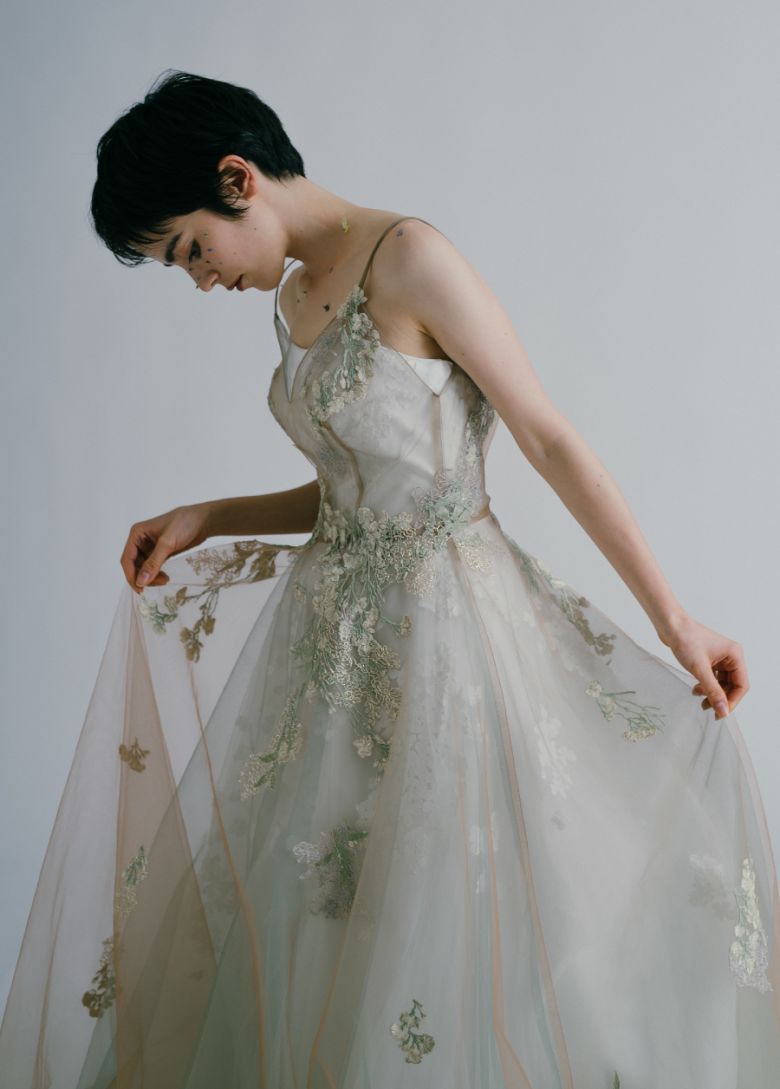 イエローやグリーン、シルバー、ゴールドの糸を繊細に刺繍したピスタチオカラーのモチーフがポイント、さらに2色の異なる色のチュールを重ねることで生まれる絶妙なカラーニュアンスが透明感の中に奥行きを感じさせてくれます。レイヤードしやすい軽くて透明感のあるチュールワンピースタイプのため、さらっと羽織るだけでニュアンスカラーにイメージチェンジが出来ます。ベースのドレスの色味やデザインを生かすデザインだからこそ、ご自身が選んだドレスによって表情を変えていくので、自分だけのオリジナルのスタイリングが叶います。