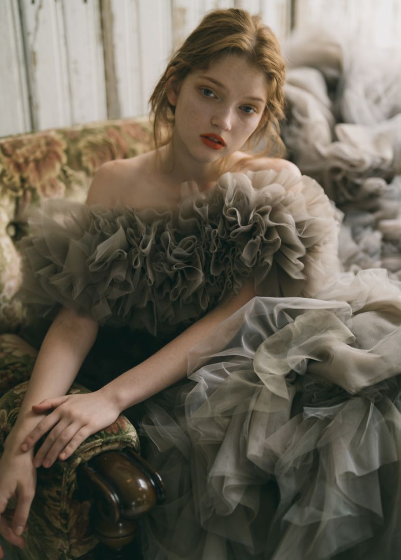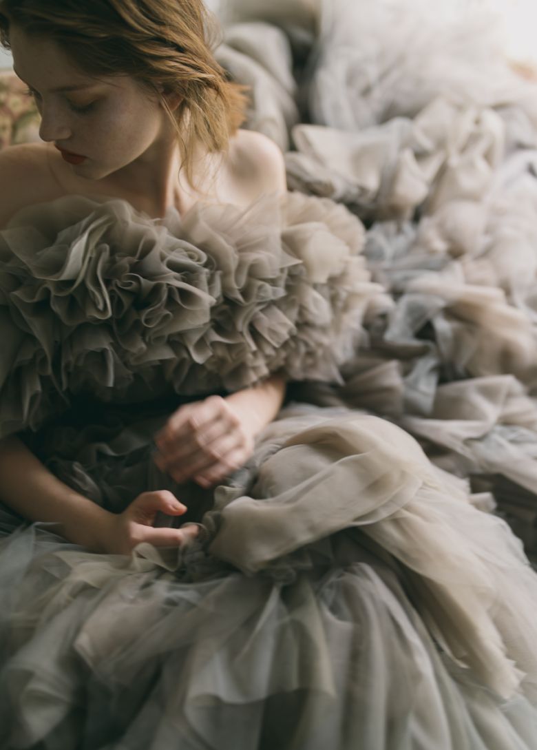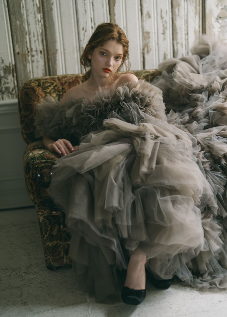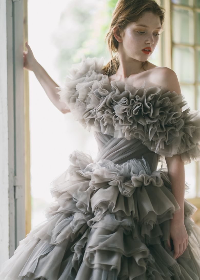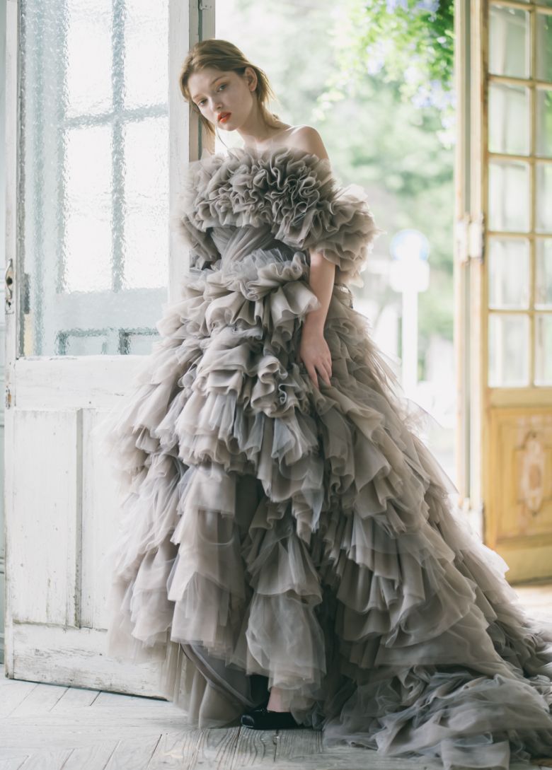 夢見るように心が弾むボリュームドレス。ホイップクリームのようなフリルは、4色のチュールをレイヤードした絶妙なアッシュグレーに。ナチュラルな足見せで自分らしさをスタイリング。