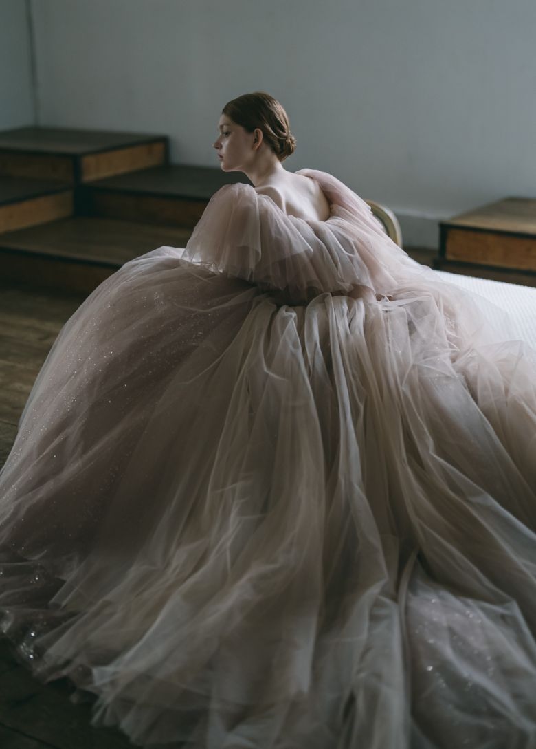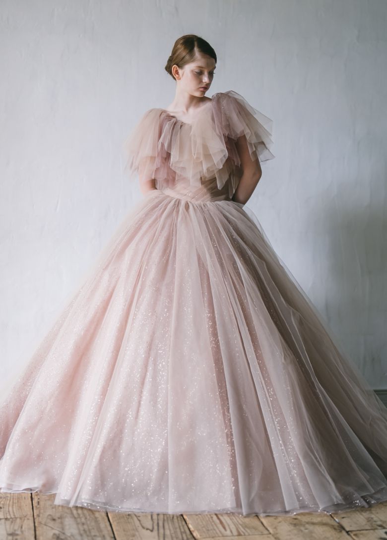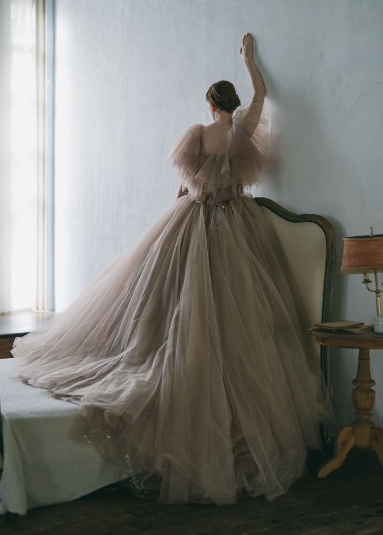 やわらかな幸せに溢れたピンクベージュ。ときめくボリュームラインにイノセントな輝きに満ちた最愛ドレス。