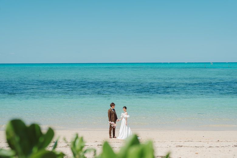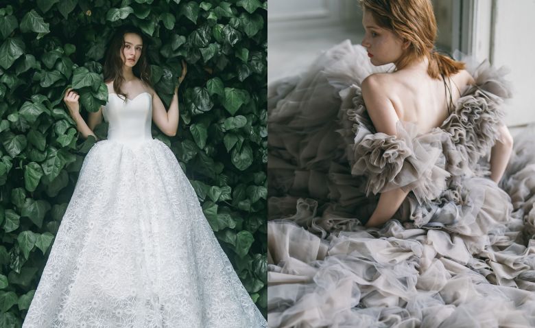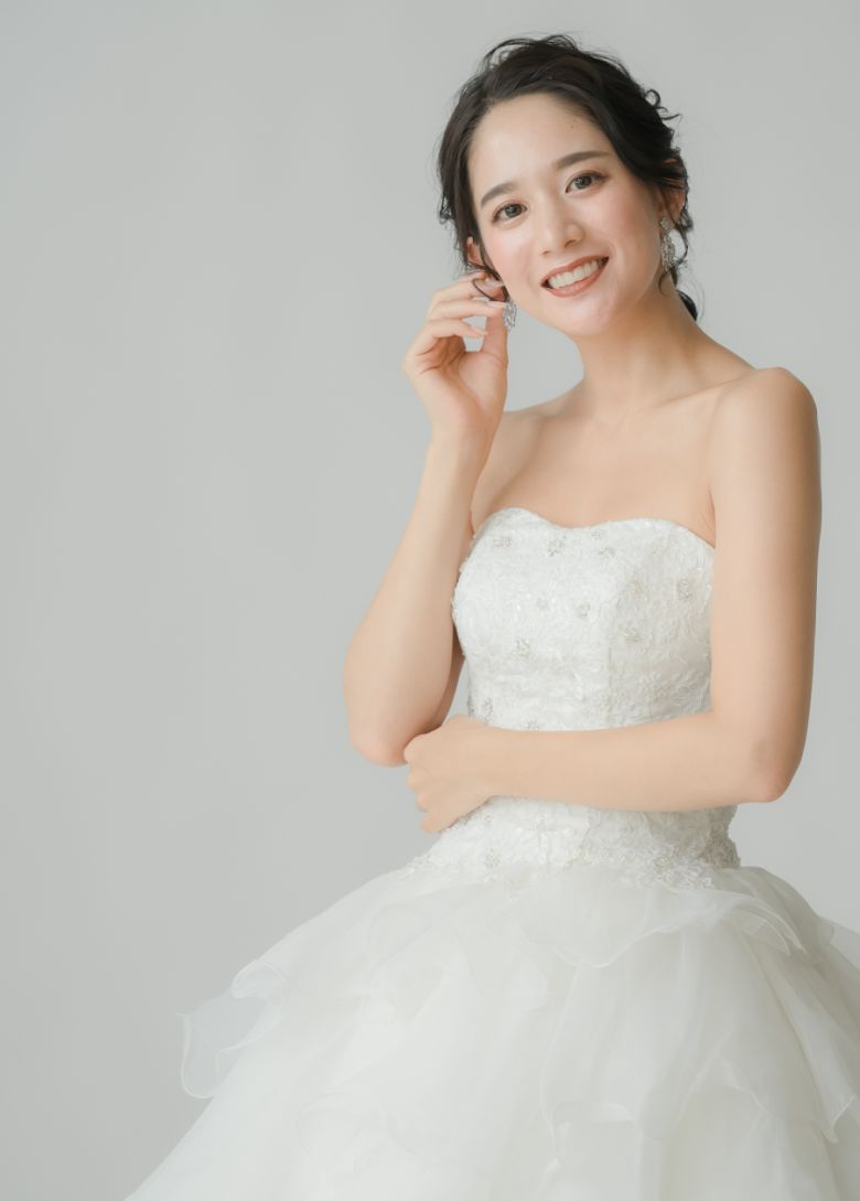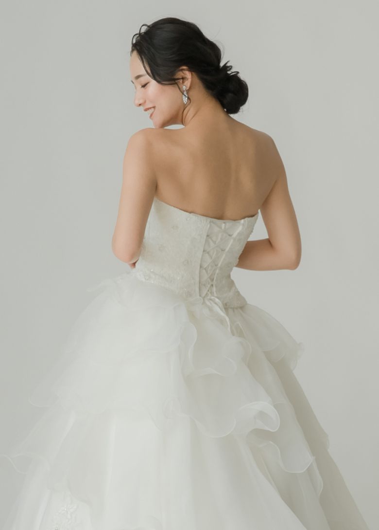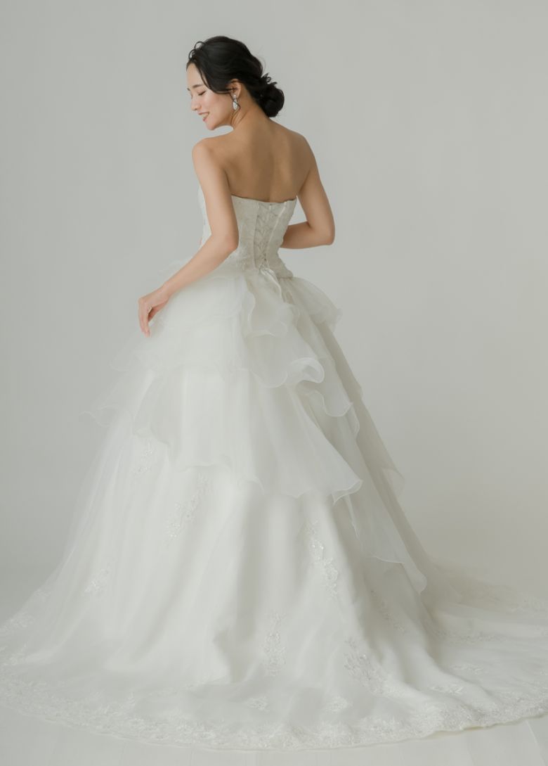 オーガンジーのアシンメトリーなフリルと、身頃・裾部分のビーズ刺繍とレースが清楚。可愛いイメージのプリンセスラインドレス。斜めにデザインされたウエストはスタイルアップ効果あり。