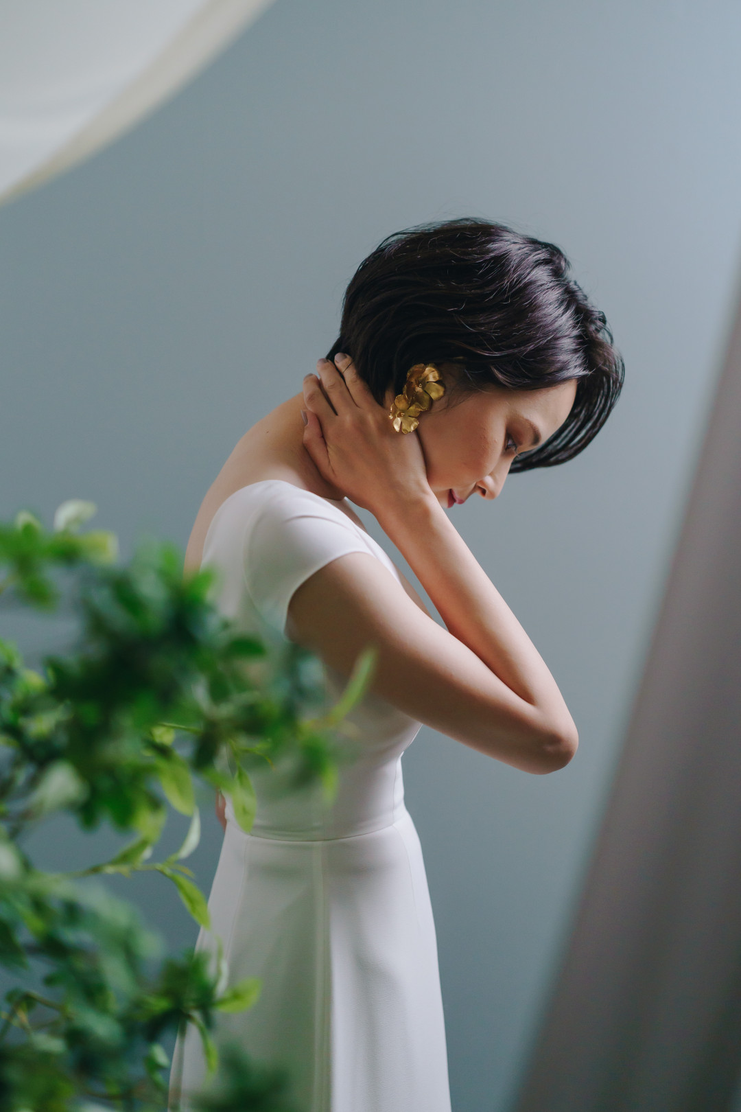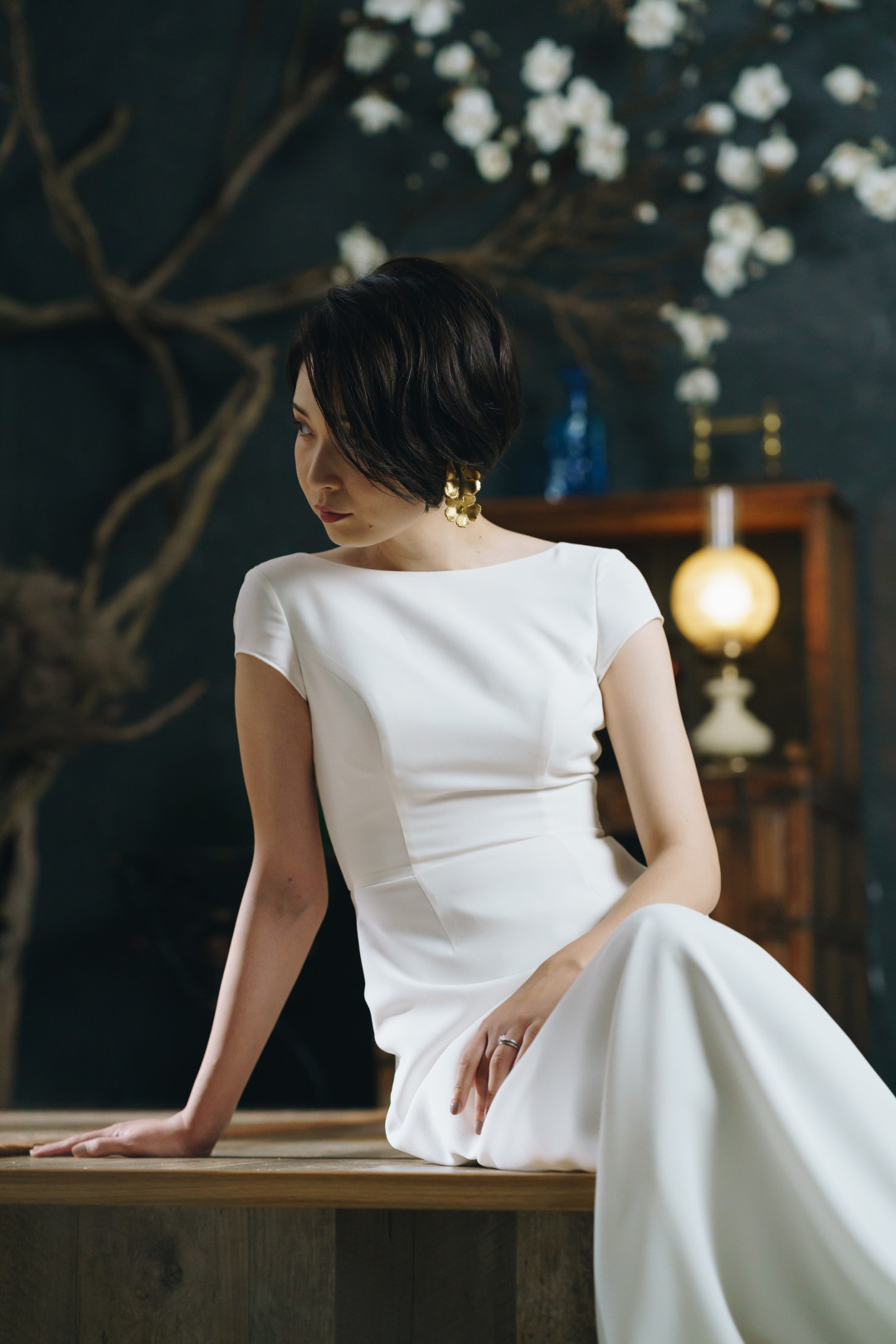 しなやかなジョーゼットが纏う女性をより美しく魅せるストレートラインのドレス。トレンドの露出を控えたデザインはレトロモダンなスタイリングにピッタリ。