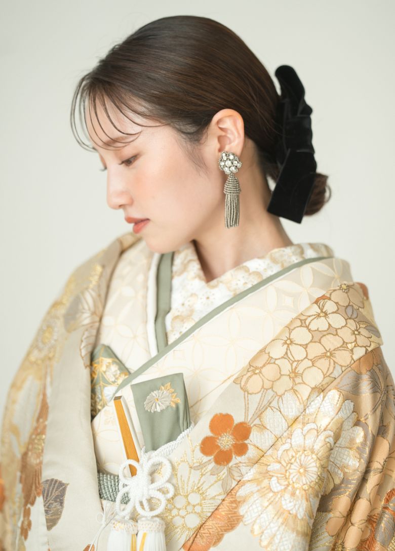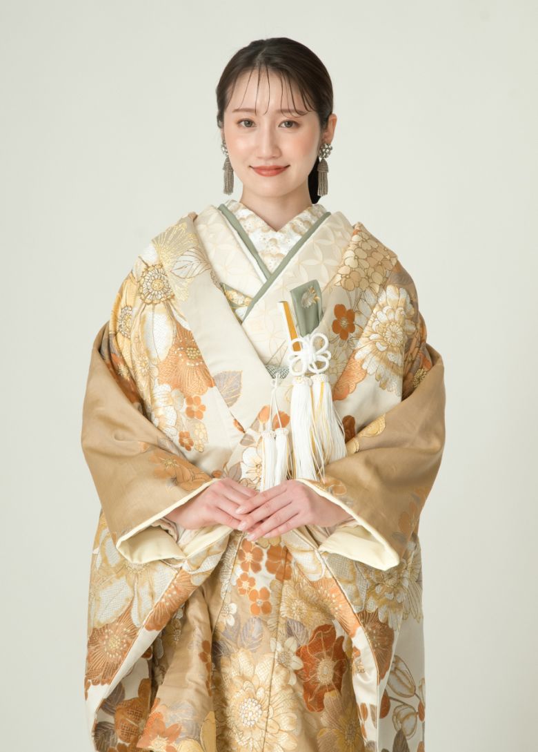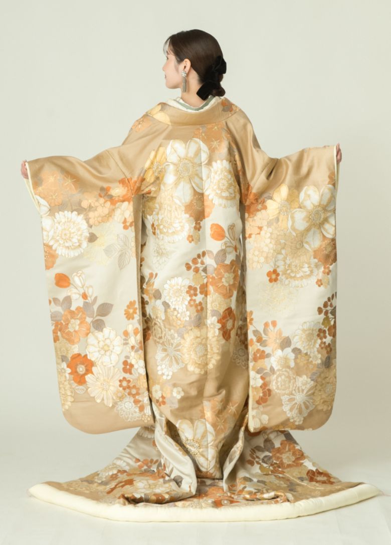 マーガレット・チューリップ・アネモネ・かすみ草など… 色とりどりの花々が爛漫に咲き誇る様を抽象的に描くことで、 アンティーク柄のような雰囲気を表現しました。ポイントに、伝統的な織の技術である「紹紦(しょうは)織(おり)」を駆使し、花びら一枚一枚に濃淡がでるように織り上げました。大ぶりな愛らしい柄行の花々を、優しい彩りで織り上げた御衣裳は佳日の花嫁様を一層華やかに演出します。