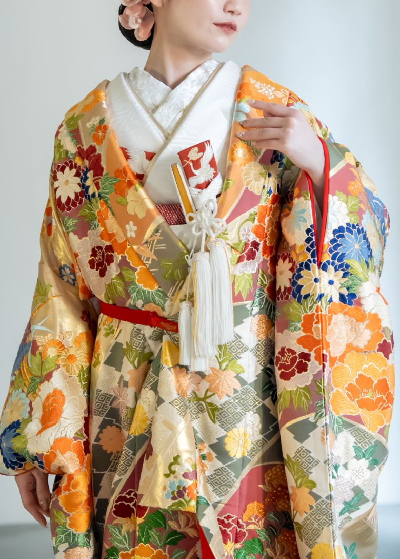 能衣装にも使用されていた、名物裂(めいぶつぎれ)と呼ばれる 高級織物の柄を題材に、様々な文様を大胆に割り付けました。また、百花の王とされる牡丹や菊・桜など春秋を彩る様々な花が咲き誇ります。 糸の使用量を多く使用しており、模様がふっくらと浮き上がる手織の織物の風合いを機械織りで表現しました。古典的な柄を現代風にカラフルな配色で仕上げた豪華で華やかな印象の高級感のある御衣裳です。