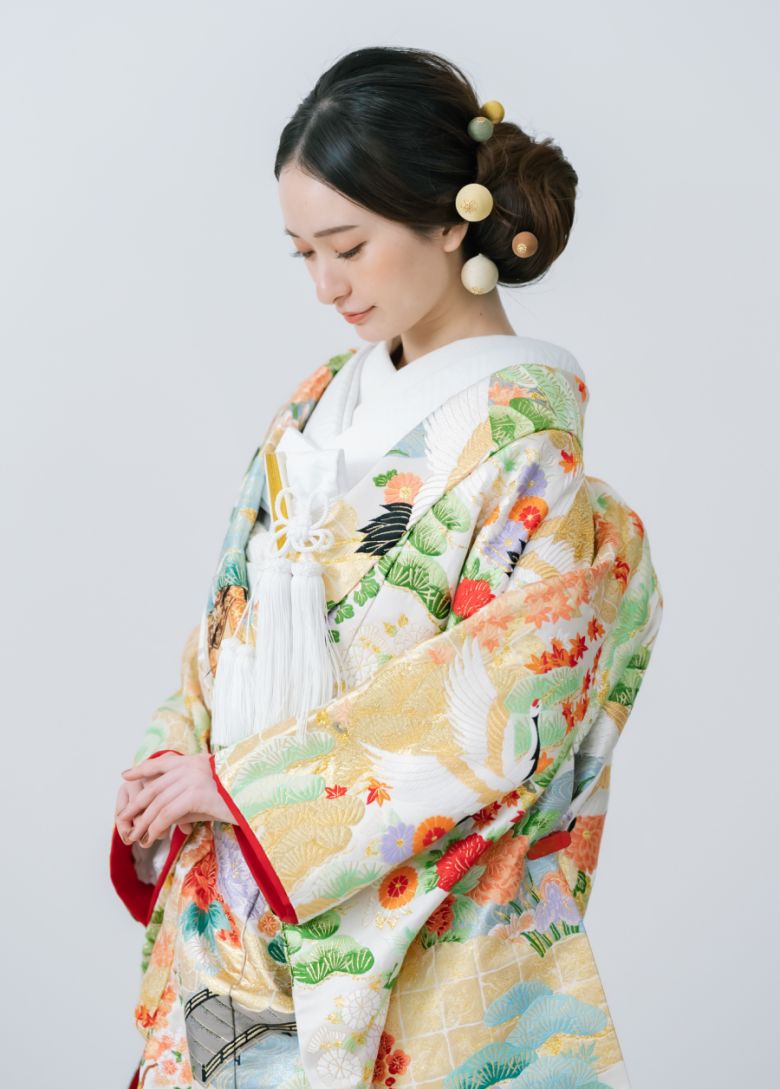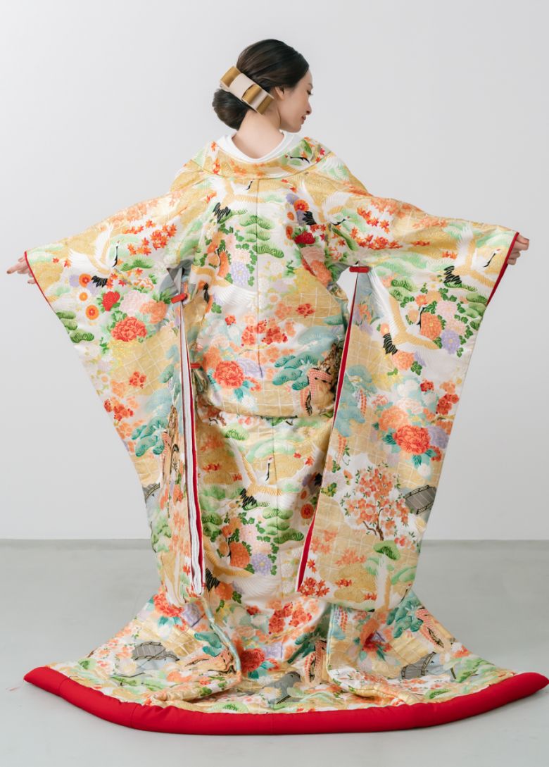 王朝時代の雅やかさを象徴する御所車をポイントに四季の花々を色鮮やかに描きました。その華やかな光景の中を舞い翔ぶ鶴の姿は大変優美で美しくお二人の慶びを讃えているかのようです。豪華な輝きを持つ金をふんだんに用いて織り上げた西陣織の逸品です。