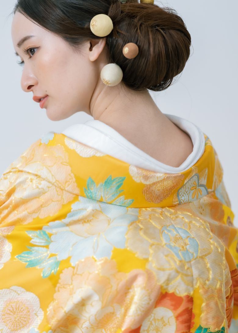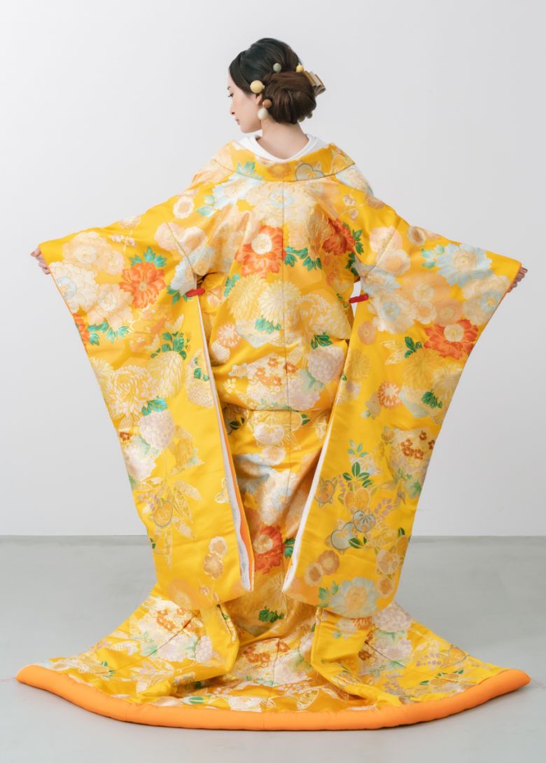 亀甲文様である六角形を単独で図形として扱い、重ね散らし、中を様々な文様で埋めております。地色も縁起の良い色とされるウコン色に染め上げ金駒刺繍を施し表現された牡丹の花は「花王」と称され富貴の象徴でもあり、その咲き誇る様子は晴れの日をより豪華に演出します。華やかな西陣織のご婚礼衣裳です。