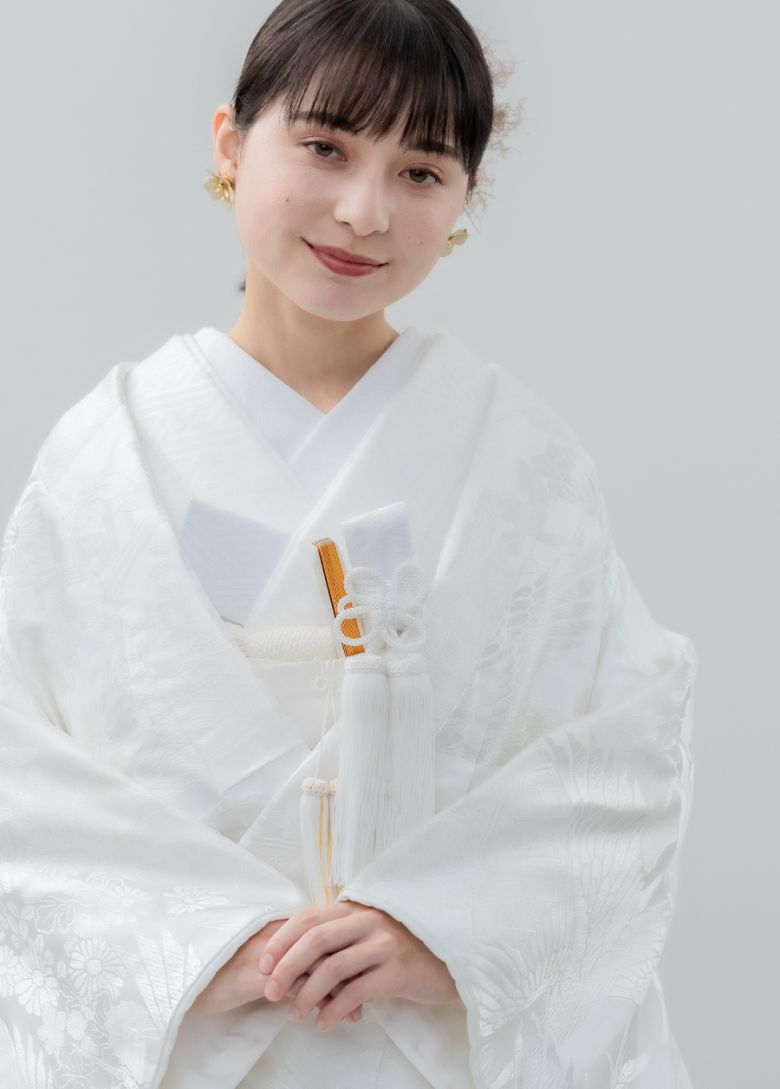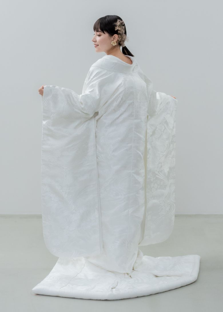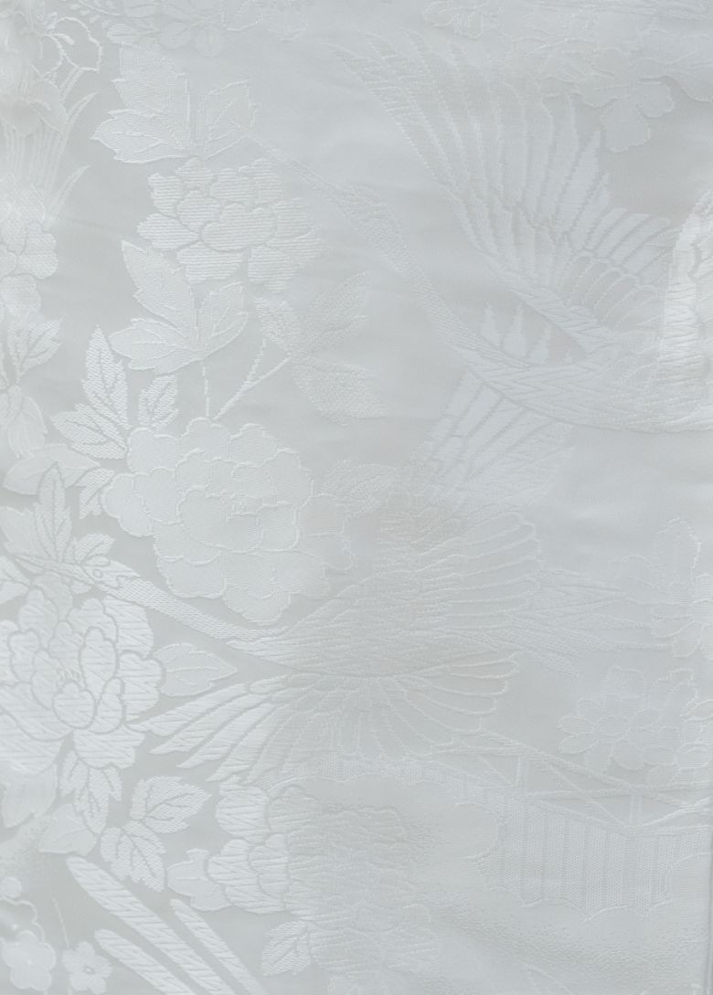 桜、牡丹、菖蒲、菊など数え切れぬ種類の花々が贅沢に散りばめられ、華やかさと愛らしさを兼ね備えます。優雅に鶴が舞い、趣きある白無垢です。