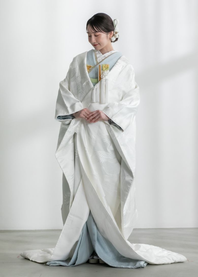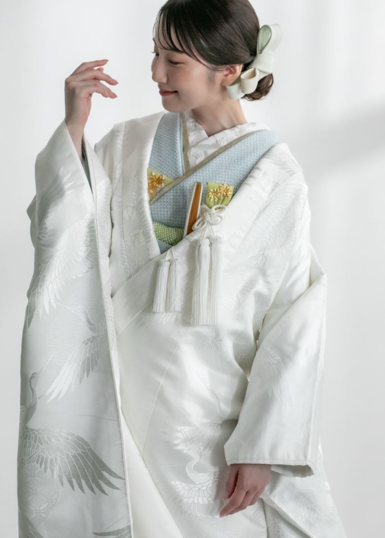 大きな鶴と流水文様が女性の美しさを演出します。鶴は「生命力の豊かさ」「長寿」を意味する神秘的で縁起の良い鳥。幸せを祝う場の着物の模様として選ばれてきました。鶴は一度夫婦になると一生添い遂げる唯一の動物。子どもが旅立つまで夫婦仲よく寄り添う、という夫婦円満の意味もあります。