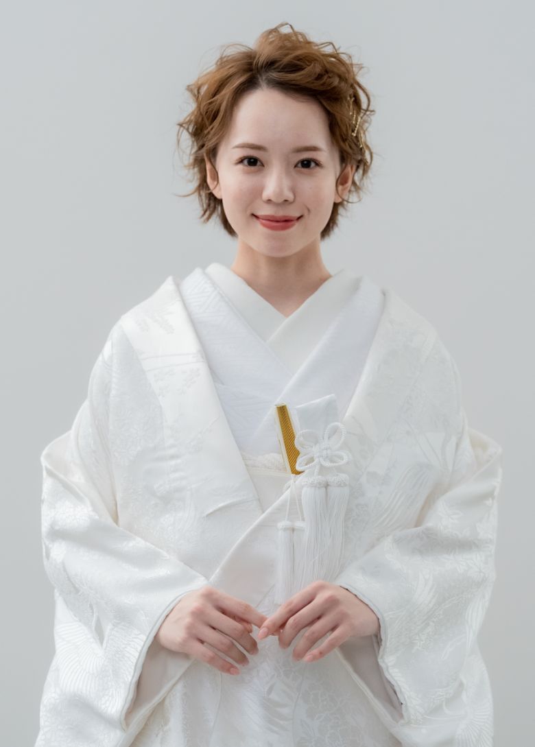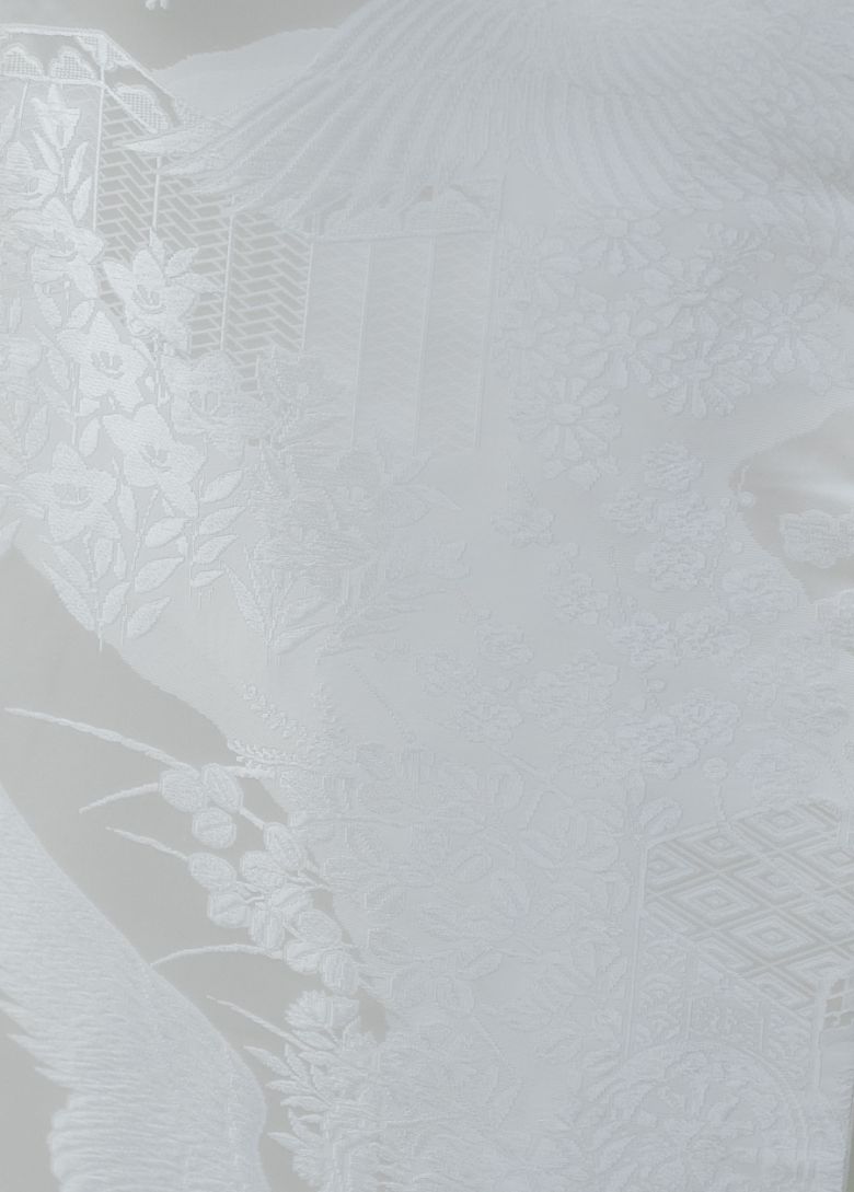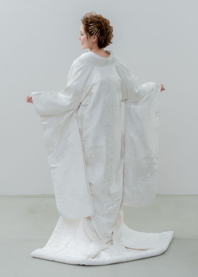 日本の四季をあらわす様々な花に加え、御所車や鶴が贅沢かつ繊細に描かれた華やかで格調高い白無垢です。