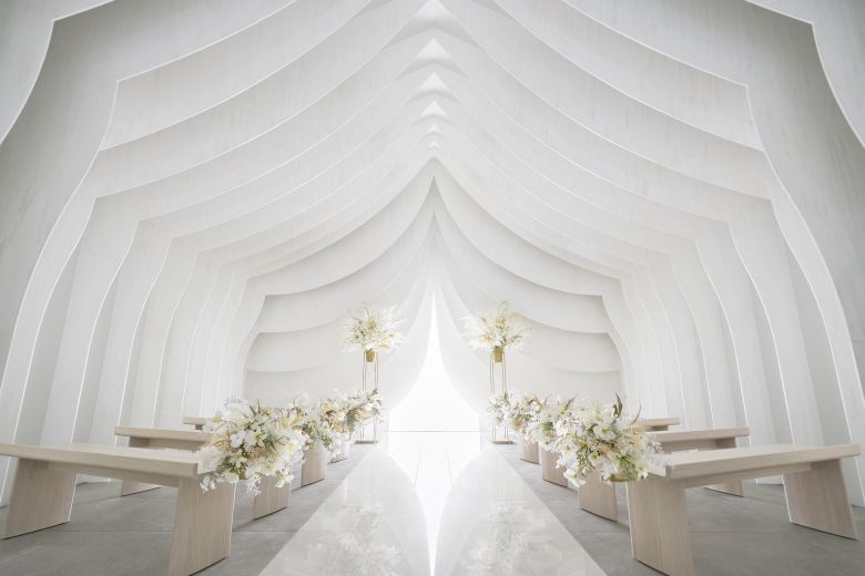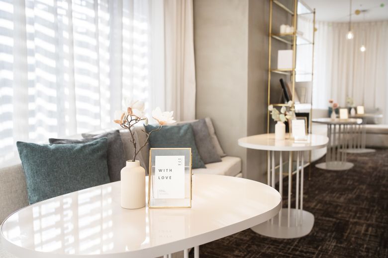 福岡の中心、大名エリアに位置する「ラヴィファクトリー福岡店」。石造りの外観が印象的な建物に一歩足を踏み入れると、上品なインテリアとやわらかな照明に包まれたサロン、ゆったりとしたカウンターや待合スペースで、リラックスしてお過ごしいただけます。 スタジオは光の陰影が美しく映える設計で、ドレスにも和装にも映える多彩なスタジオをご用意しています。お客さまにお会いできる日を、スタッフ一同楽しみにしております。