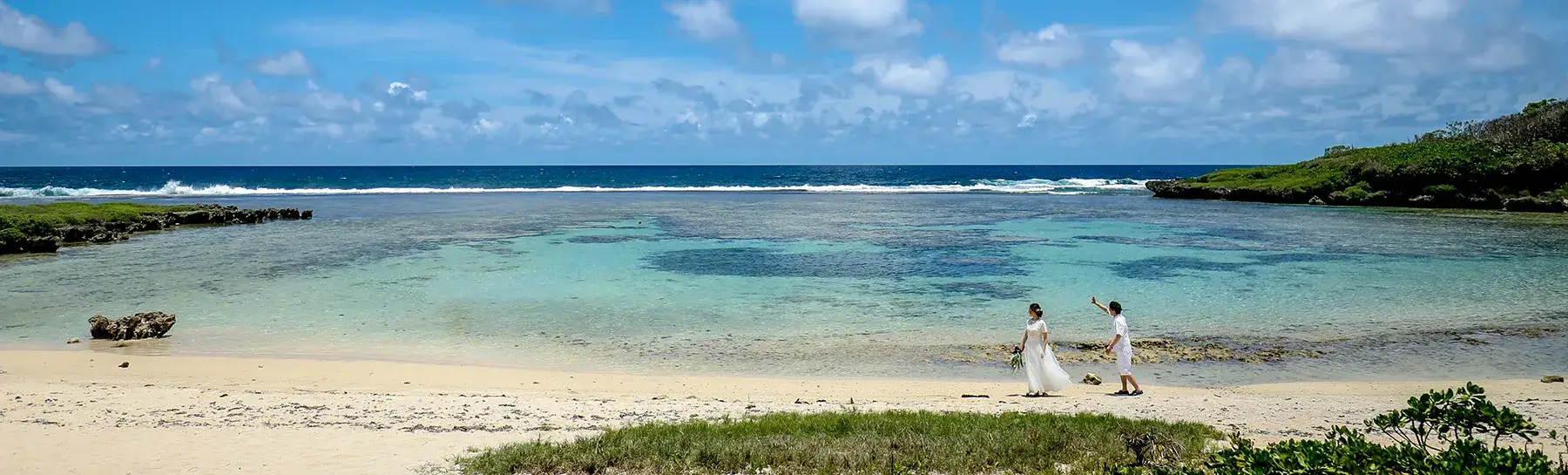 グアム島の豊かな自然が残る南側エリア。白い砂浜と透き通った青い海が広がるロケーションが豊富にあるグアムを巡るリゾートフォトツアー。美しい緑の森に青く透き通った海、真っ白な砂浜でリゾート気分を味わいながらお二人の思い出に残る素晴らしいウェディングフォトをお楽しみください。