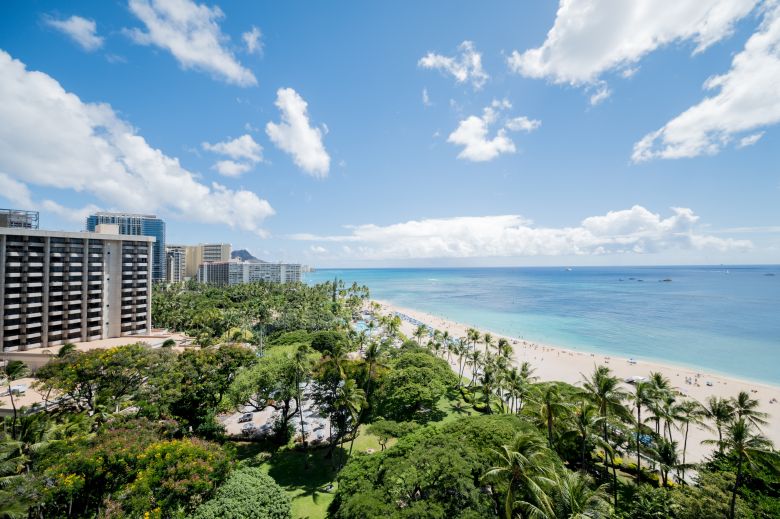 冬のハワイは湿度が低く、空の青がより深く澄みわたる季節。ワイキキビーチ周辺では、夏よりも空と海のグラデーションがくっきりと映り、写真に立体感が生まれます。