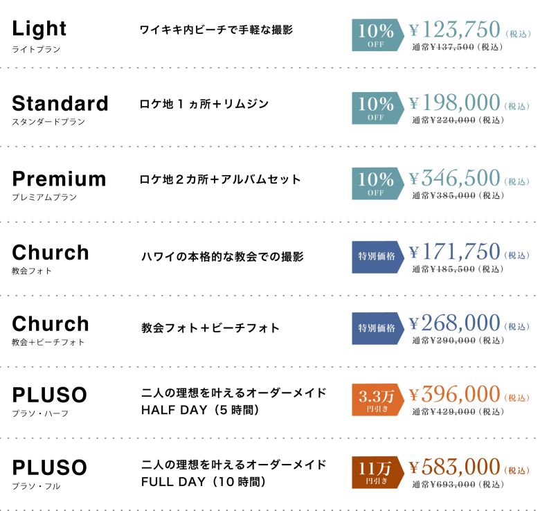 手軽なライトプランから、スタンダード・プレミアムプランもご用意。ハワイを満喫するなら、二人の叶えたいことを詰め込めるオーダーメイド(プラソ)がおすすめ◎