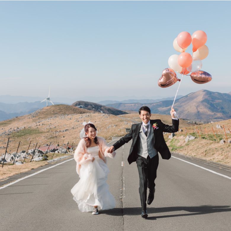 四国カルストの雄大な山々を背景に、大自然のなかで開放感あふれるフォトウェディングを実現しました。
