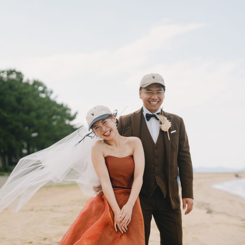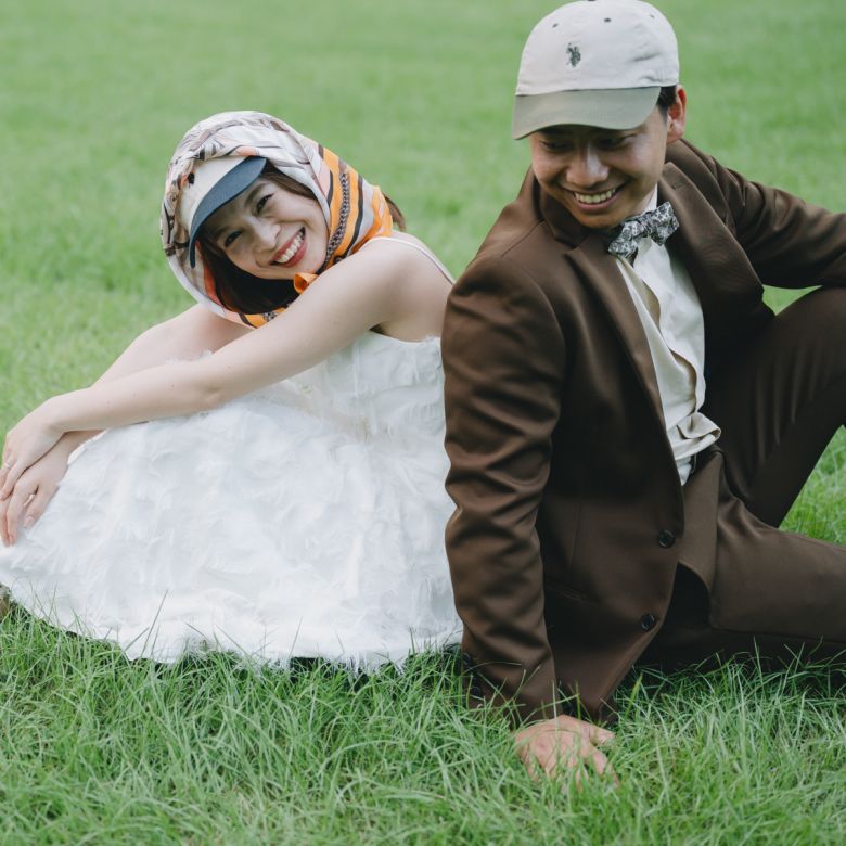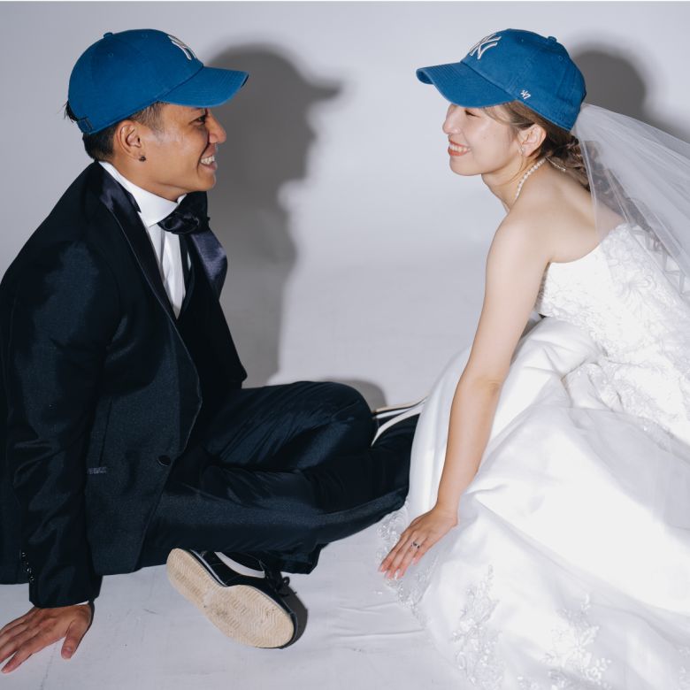 小物使いは、カジュアルフォトウェディングのオリジナリティを高める絶好のポイント。 帽子やスニーカー、リュックなどのファッションアイテムを取り入れることで、おふたりらしさを引き出せるのはもちろん、一気に垢抜けた印象になります。