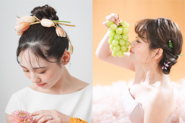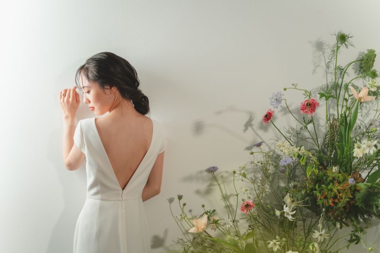 ミディアム・セミロングは、生花が映える絶妙なボリューム感で印象を自在に操れます。ブーケと花材を揃えると、統一感もアップします。