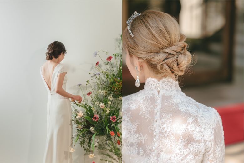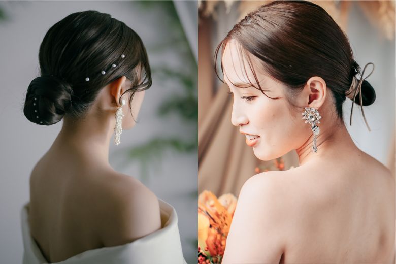 低めにまとめるローシニヨンはまさに正統派スタイル。ツイストや編み込みを加えることで、ミディアム・セミロングでも華やかに仕上がります。クラシカルなドレスやティアラとの相性も抜群です。