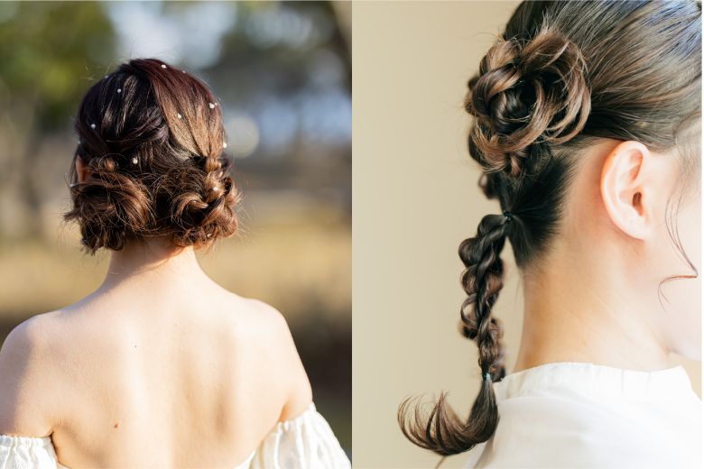 艶やかにまとめた高めのアップスタイルに、春を象徴するチューリップを大胆にあしらったデザイン。ツインアレンジなら、サイドからねじりを加えた柔らかなまとめ髪に。可憐な小花をランダムに散りばめてまるでお花畑から抜け出したようなロマンティックなバックスタイルを叶えます。パステルカラーやチュール素材のドレスと相性抜群です。