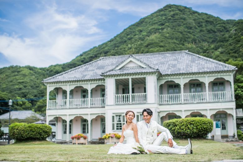 重要文化財に指定される、熊本県内に現存する最古の洋館。明治時代に建てられた、ピーコックピーコック・グリーンのおしゃれでクラシカルな建物はドレスでの撮影にぴったり。館内には歴史を感じる家具や調度品が配され、どこを撮っても絵になります。クラシックな雰囲気に包まれて撮影をお楽しみただけます。