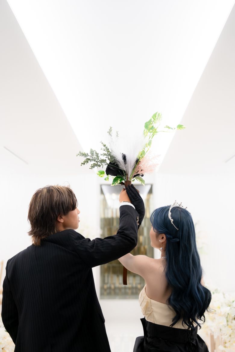 おふたりが自分たちで作った持ち込みブーケを掲げて一枚!!