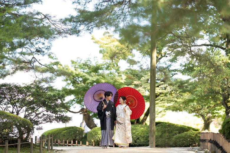 兼六園の新緑がきれいな道で和傘を使って華やかに一枚!!