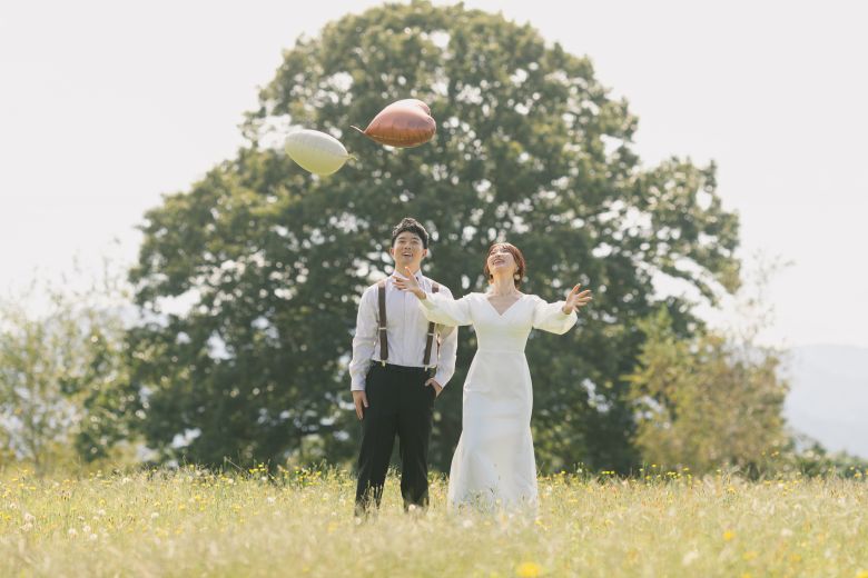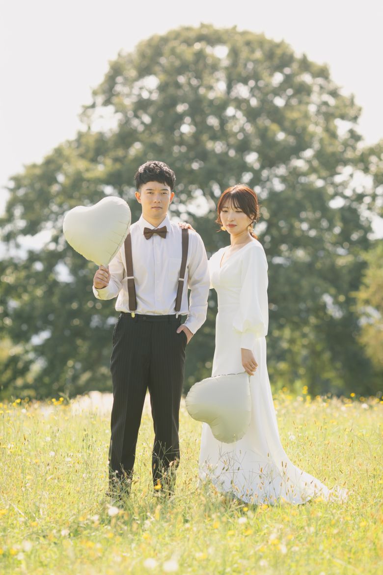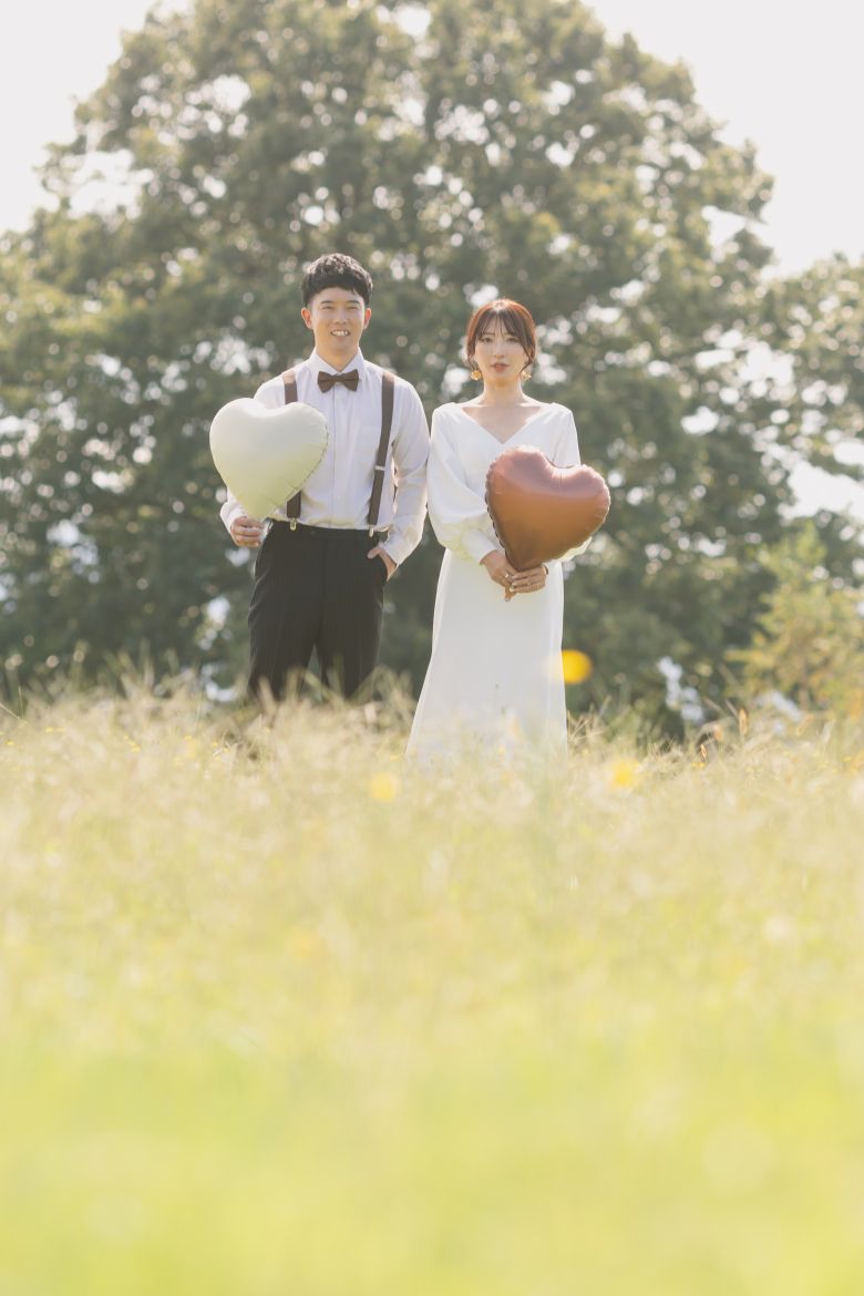 かわいいおふたりの持ち込みグッズハートバルーンで一枚!!!