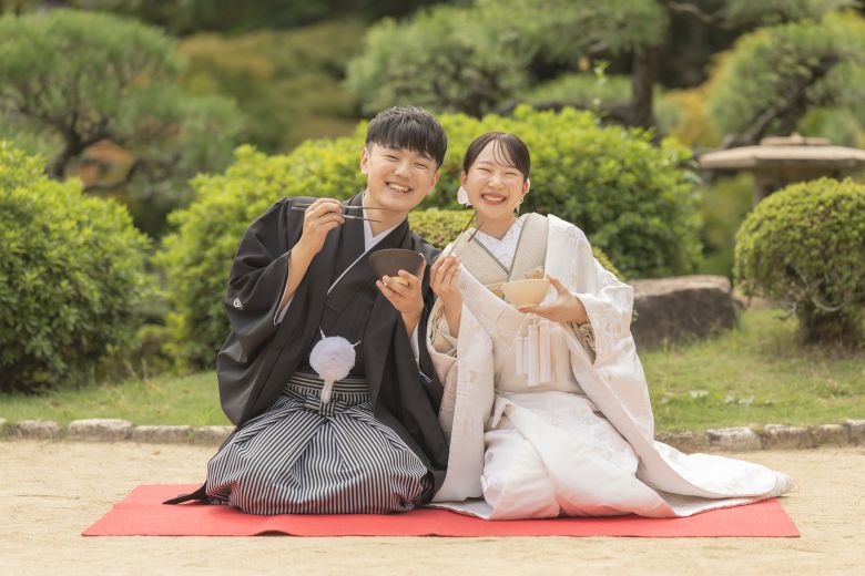お揃いのお茶碗を持っていただきますショット!