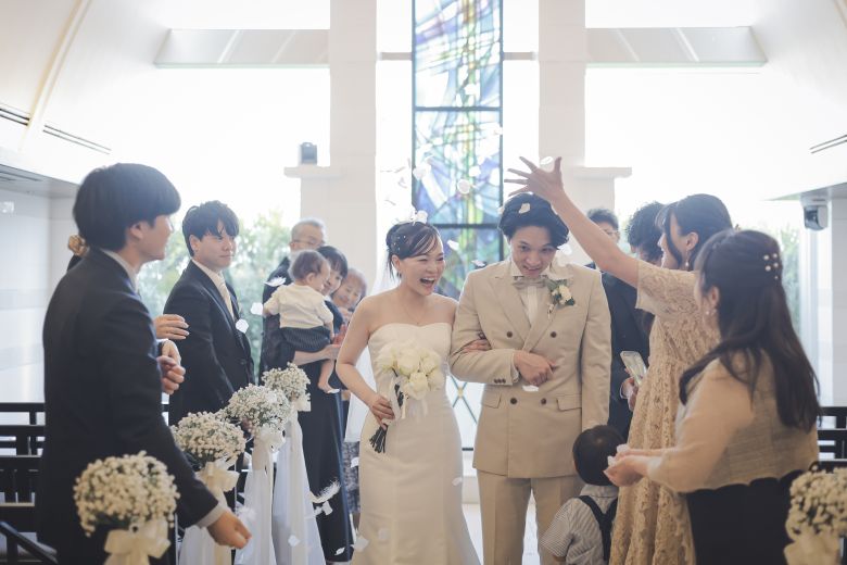 指輪の交換・ベールアップ・誓いのキスと進み新郎新婦様ご退場時はフラワーシャワーでお見送りをしました