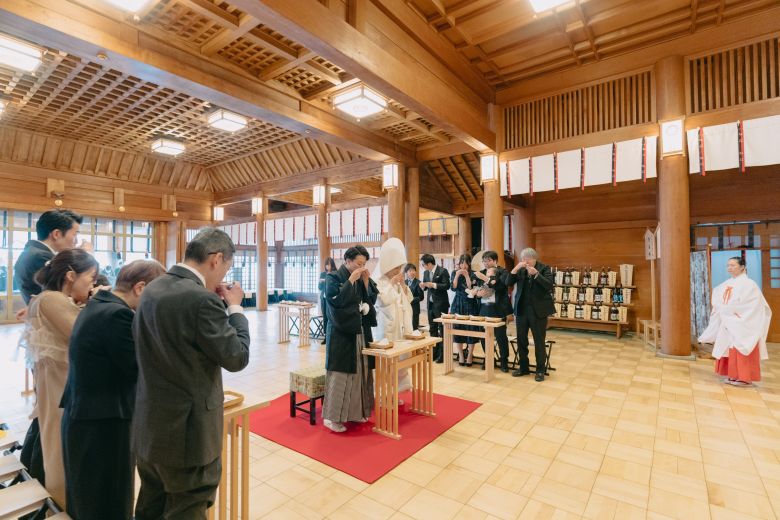 「神前式」は、神道の神々に誓いを立てる挙式スタイル。神道とは、古来から続くやおよろずの神様への信仰のこと。神事をつかさどる斎主が結婚を伝える祝詞を奏上し、三三九度の杯を交わします。