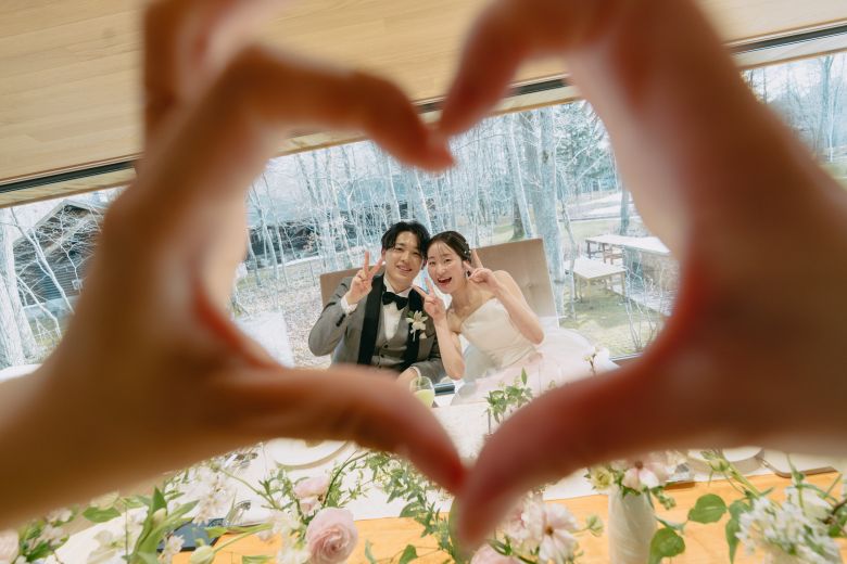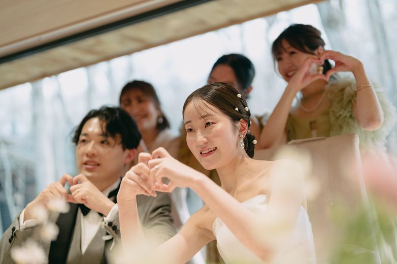 ご新婦様のご友人と。みんなでハートを作るだけでカワイイお写真に♡