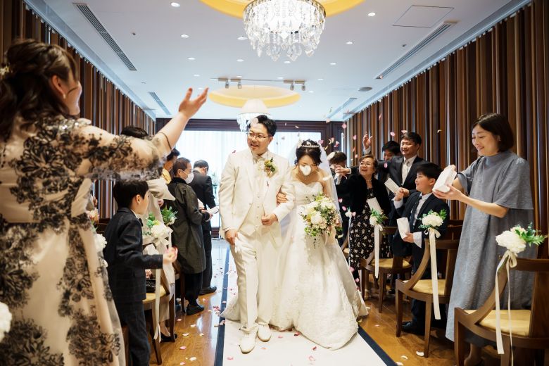 ゲストの皆さまによる、花びらでおふたりの結婚を祝福するフラワーシャワー💕💕🥀