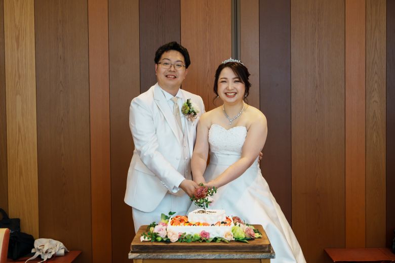 幸せあふれる笑顔がすてきなおふたりらしいケーキカットの一枚🍰°˖✧