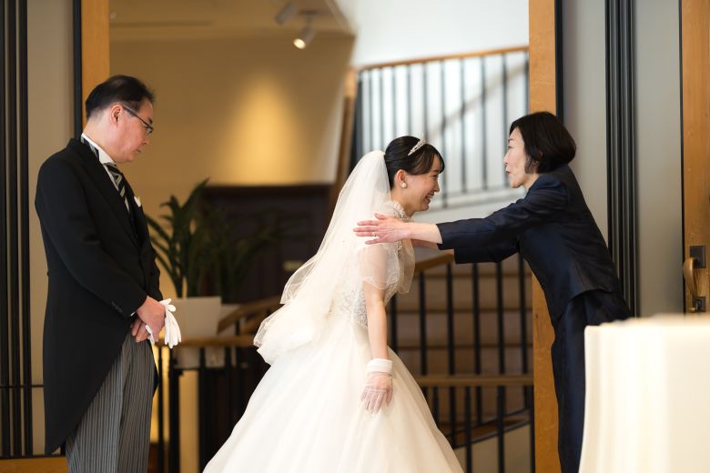 お母様が娘にしてあげる”最後の身支度”と言われる、ヴェールダウン。何年かぶりのお手伝いになんだか照れくさくて笑顔を見せるご新婦様でした*^^
