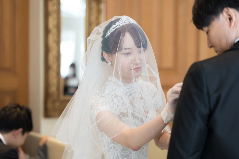 ご新郎様のブートニアを直して差し上げるご新婦様。