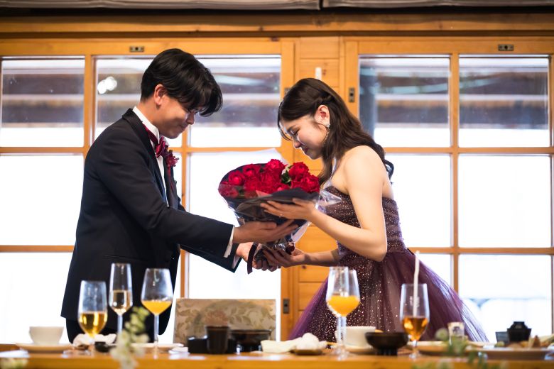 ご新郎様からご新婦様へ、薔薇のブーケのプレゼント。 ロマンチックで嬉しいサプライズですよね❀