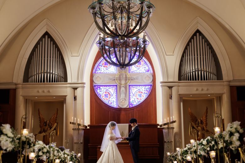 ステンドグラスが反射するバージンロードが魅力のチャペル
