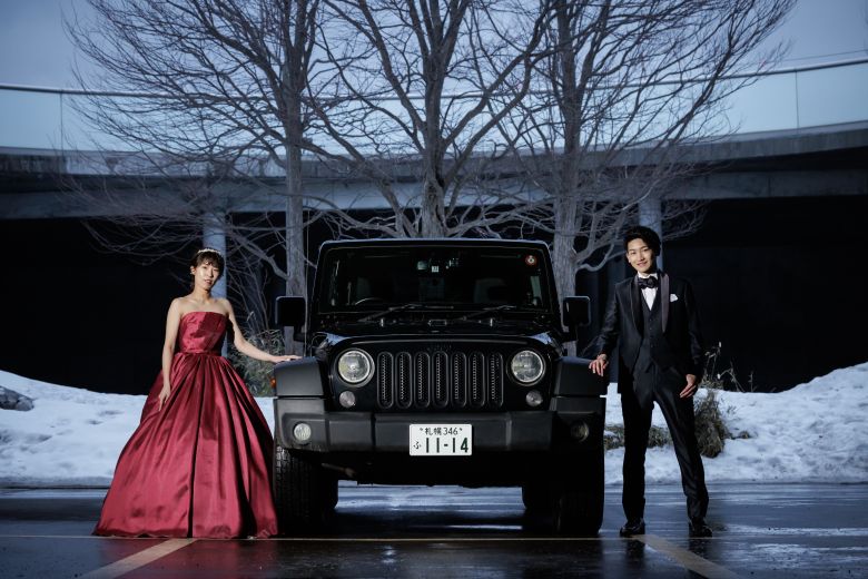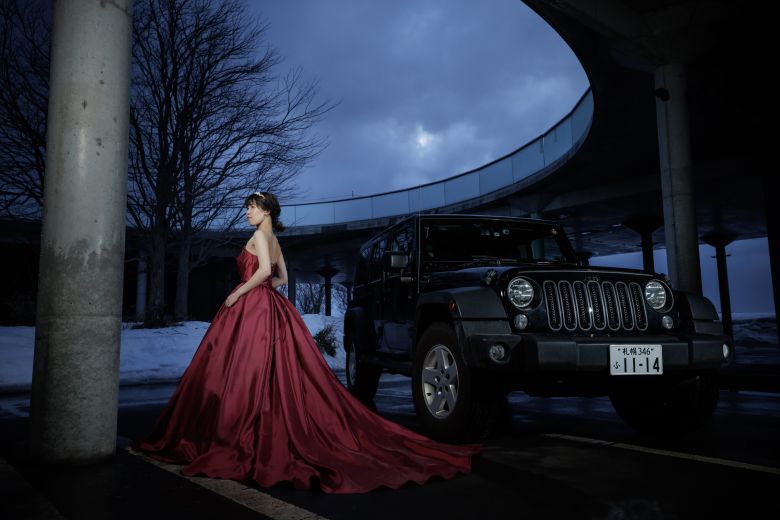 カッコいい愛車と残すおふたりオリジナルのウェディングフォト。 黒タキシードと赤いカラードレスがマッチ°˖✧