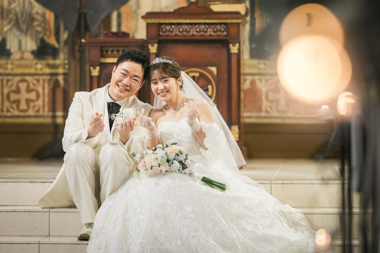 聖壇に座って一緒に指ハート♡ 豪華なチャペルに白タキシードとウェディングドレスが映えますね✧°˖