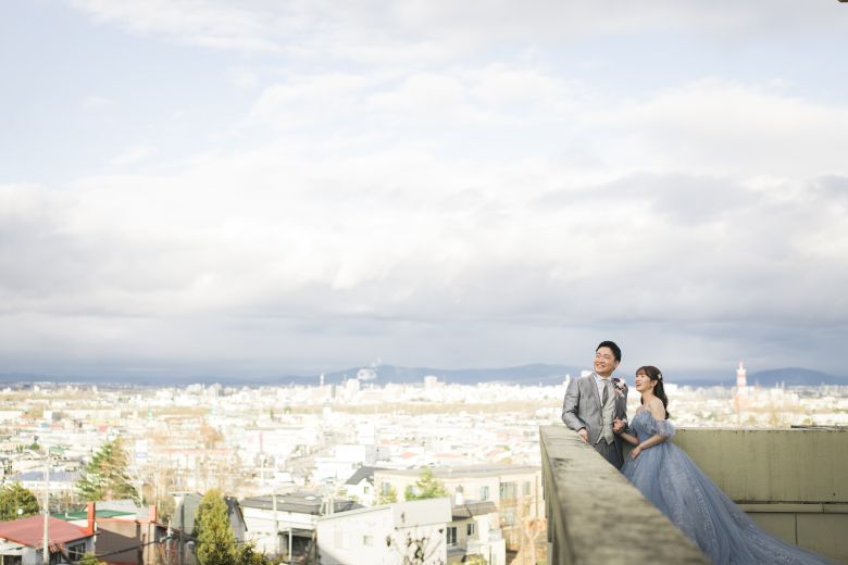 旭川の街並みを一望できるバルコニーに出て、空を見上げる王子様とお姫様♪