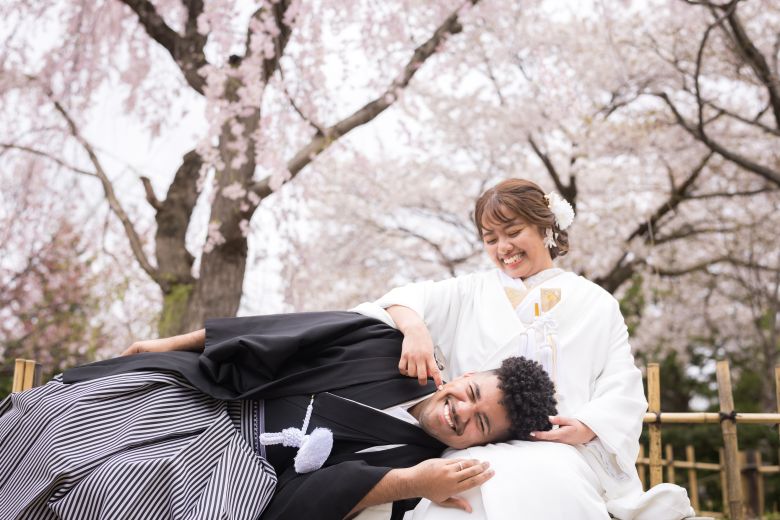 白無垢・黒紋付袴で桜のバージンロードを歩くお二人。 北海道ならではのお写真です!!