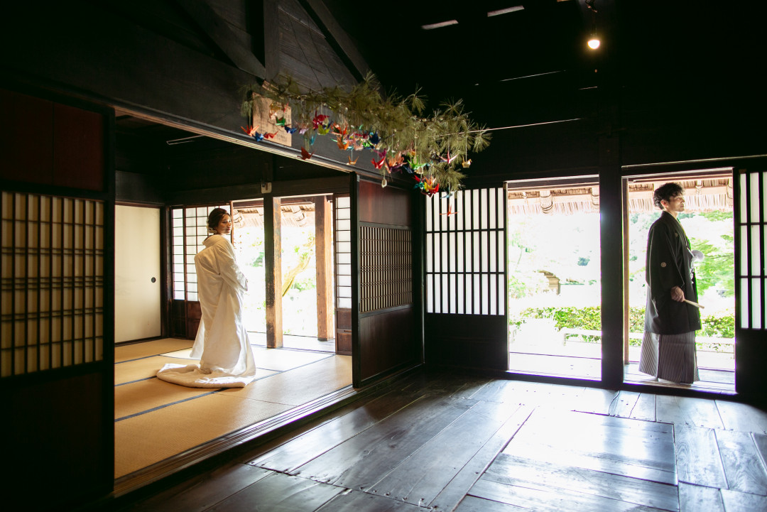 名古屋のシンボル「名古屋城」から、「東山荘」や「徳川園」など自然の彩りに染まる和のロケーションで、多彩な魅力を楽しめる全撮影データがセットになったプランです。岐阜「郡上八幡」、世界遺産「白川郷」と、名古屋を飛び出して展開している多彩な撮影スポットも魅力の一つ。どの季節でも美しい結婚写真が残せます。