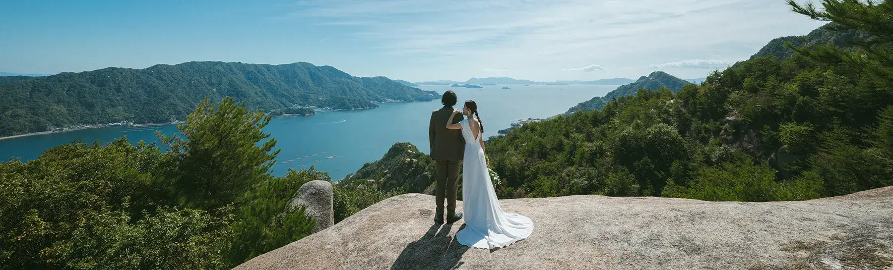 広島湾に浮かぶ大小の島で構成され多島美を感じられる島で、四季を通して様々な魅力に触れることができます。岩場での落ち着いた雰囲気、海が見えるまっすぐな一本道、海辺に沈むサンセットなど、撮る場所や時間によって全く違う表情を見せてくれる景色が魅力のひとつです。おふたりだけのかけがえのない時間を創造して、素敵な1枚を残せます。