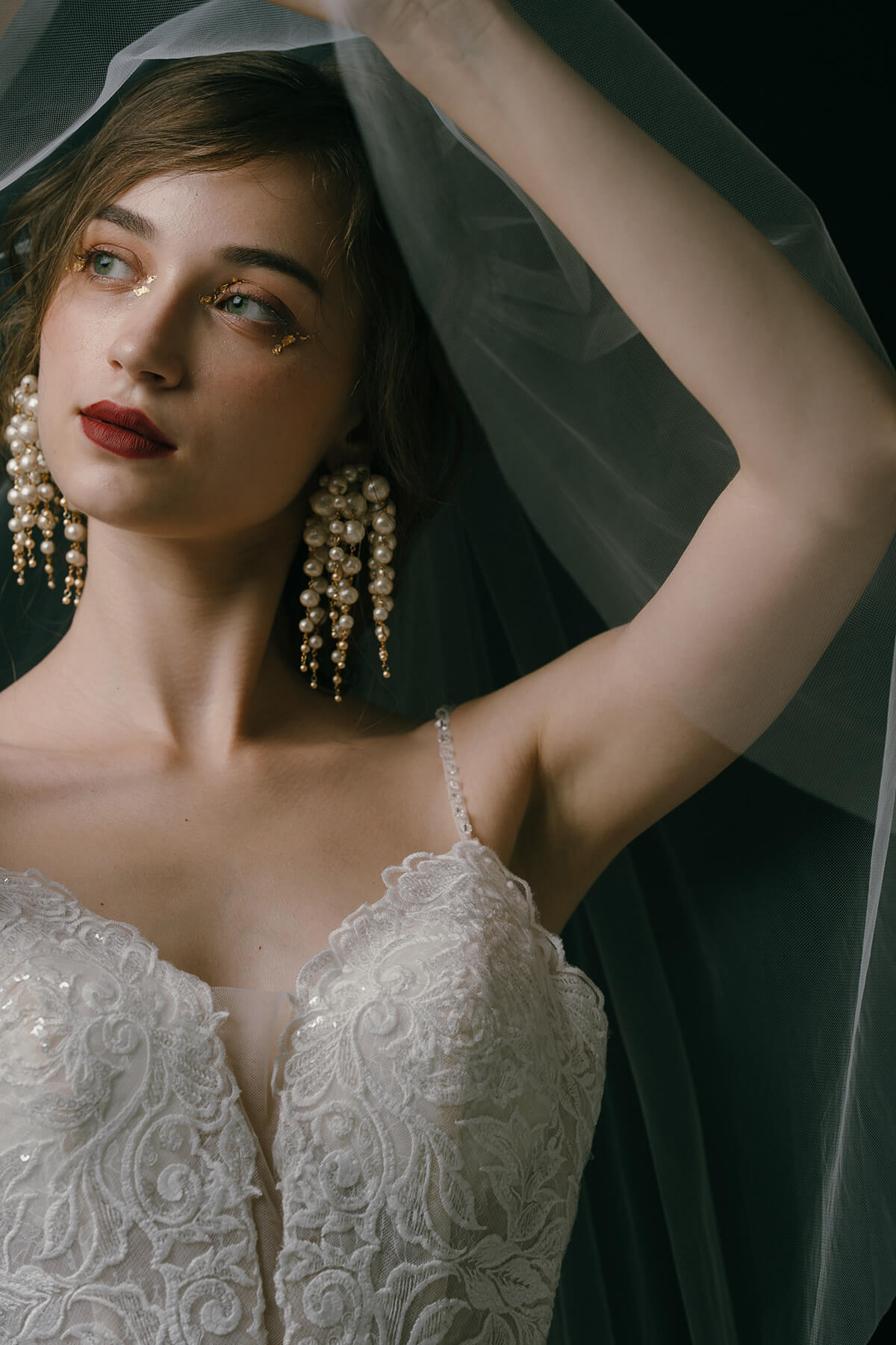 胸元の大胆なハートカットがゴージャスな大人の女性を演出してくれる1着。レースの立体感とビージングされた華奢なストラップが美しいマーメイドドレスです。背中を大きく見せるバックレスディテールで華やかでありながら抜け感のある印象に。