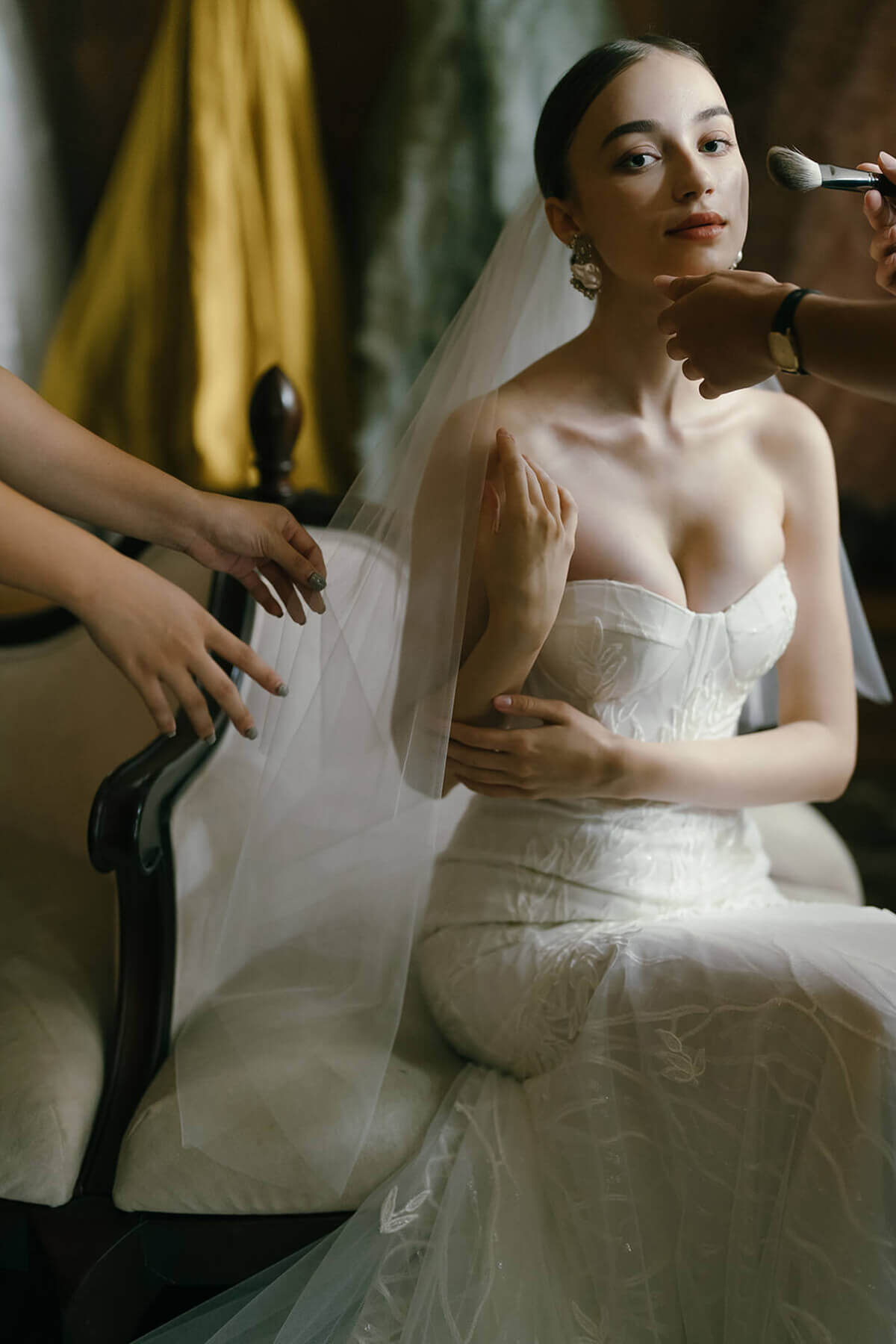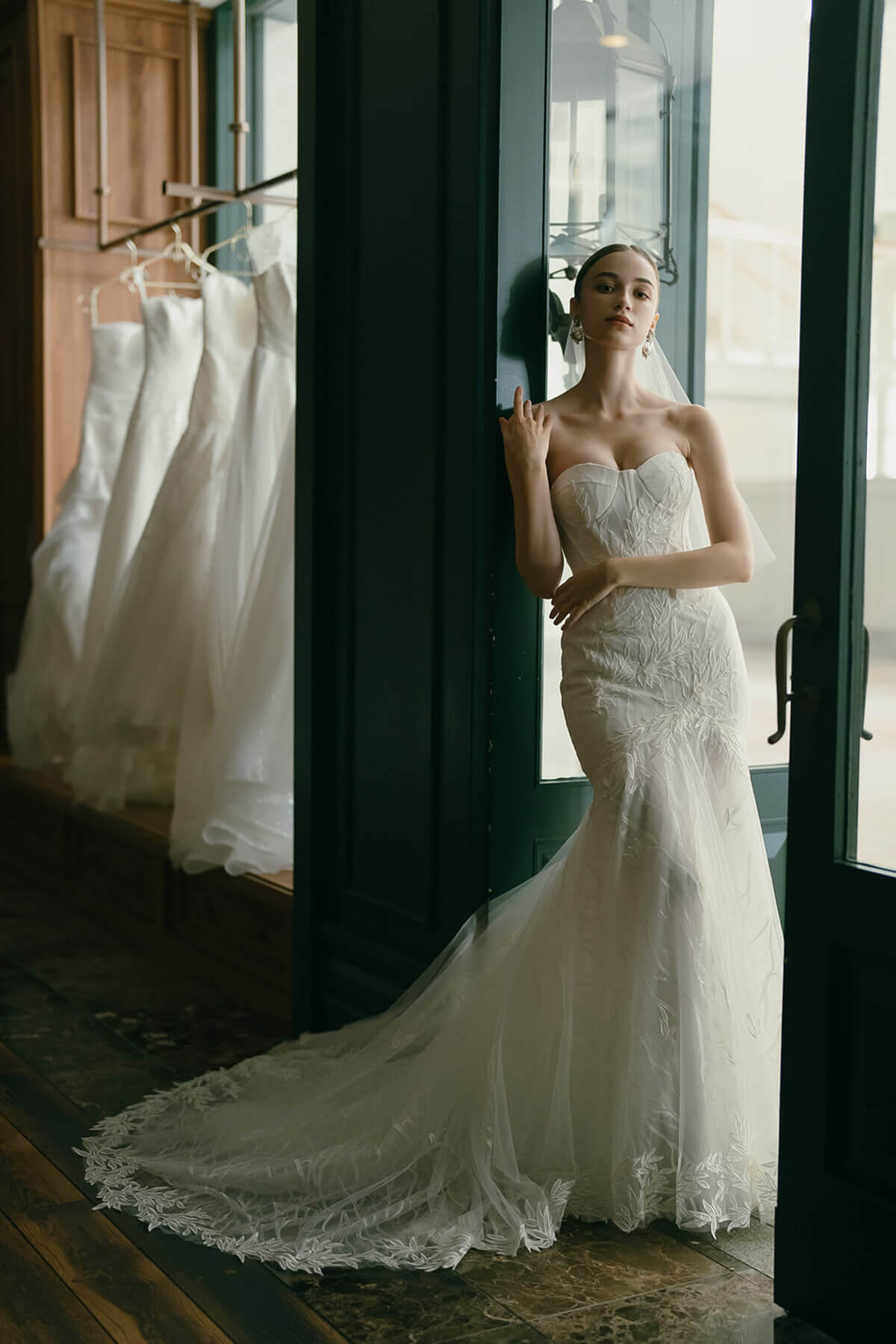 裾のリーフモチーフの華やかなレースとタイトなマーメイドラインでシャープな印象を演出してくれます。セクシーでありながらも、自分らしさを感じられる印象的な一着。ヒップラインまではタイトに、たっぷりに広がる裾までのメリハリのあるシルエットはゴージャスな印象を与えます。