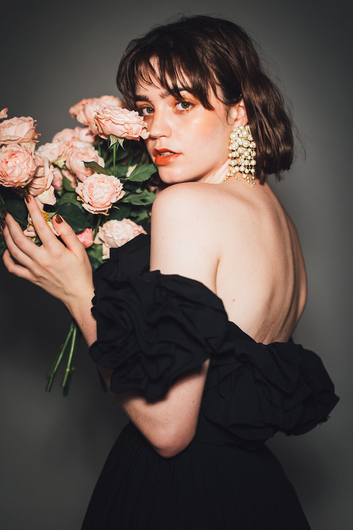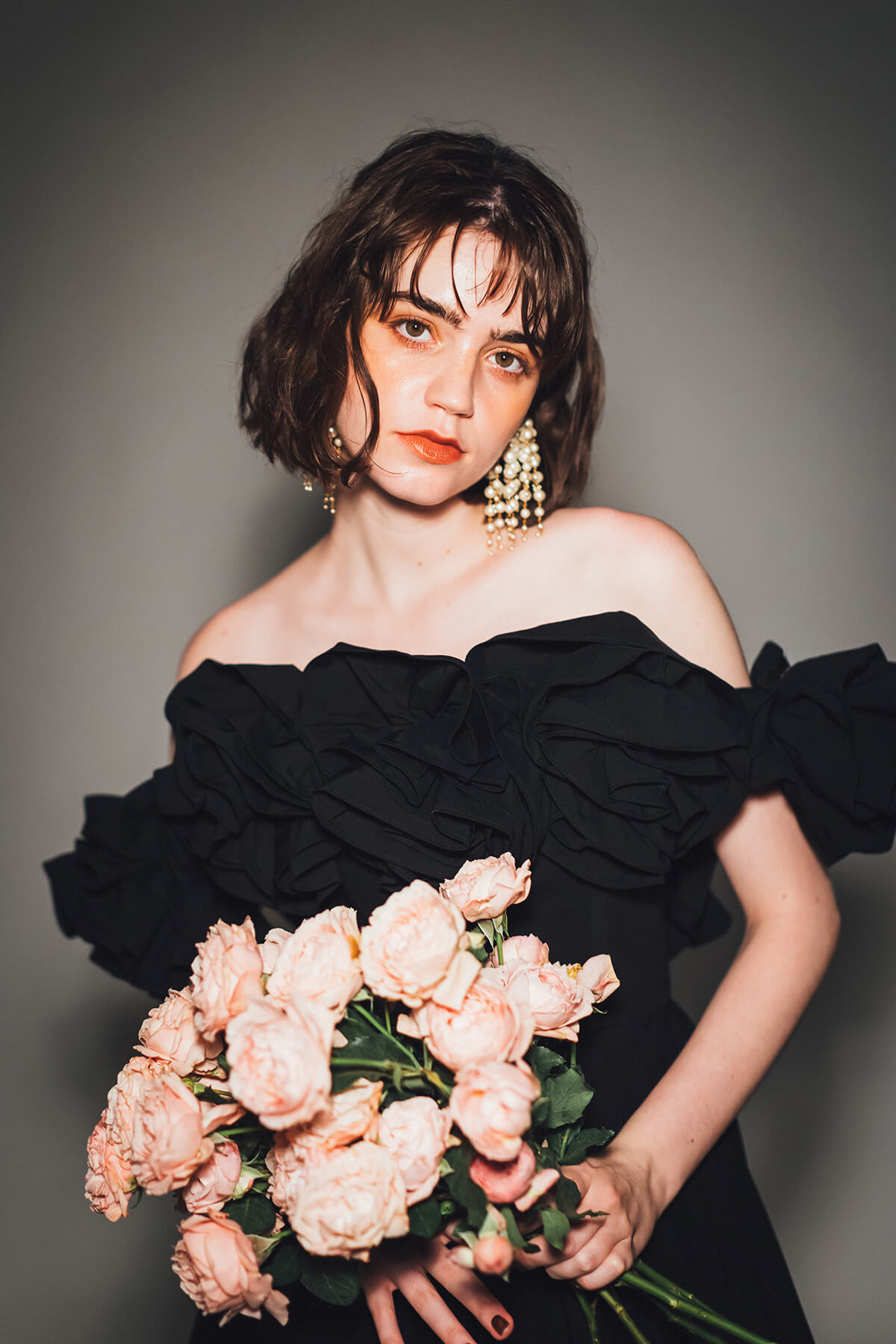 しっかりとした風合いで立体感のあるタフタ素材のプリンセスラインのドレス。光沢のないマットな生地感でできたフリルは甘くなり過ぎず存在感のある印象に。