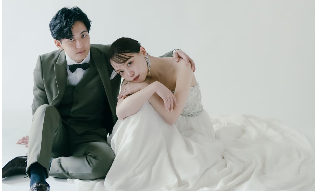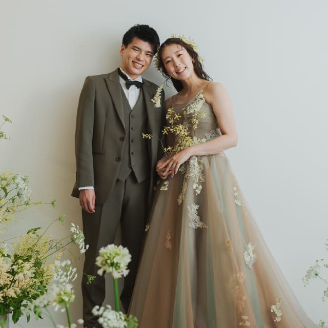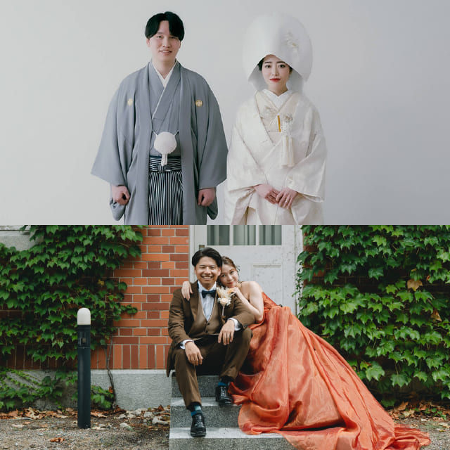 ドレス2着がセットの撮影プラン。ウェディングドレスとカラードレスなど、2着の撮影でおふたりの魅力を引き立てます。