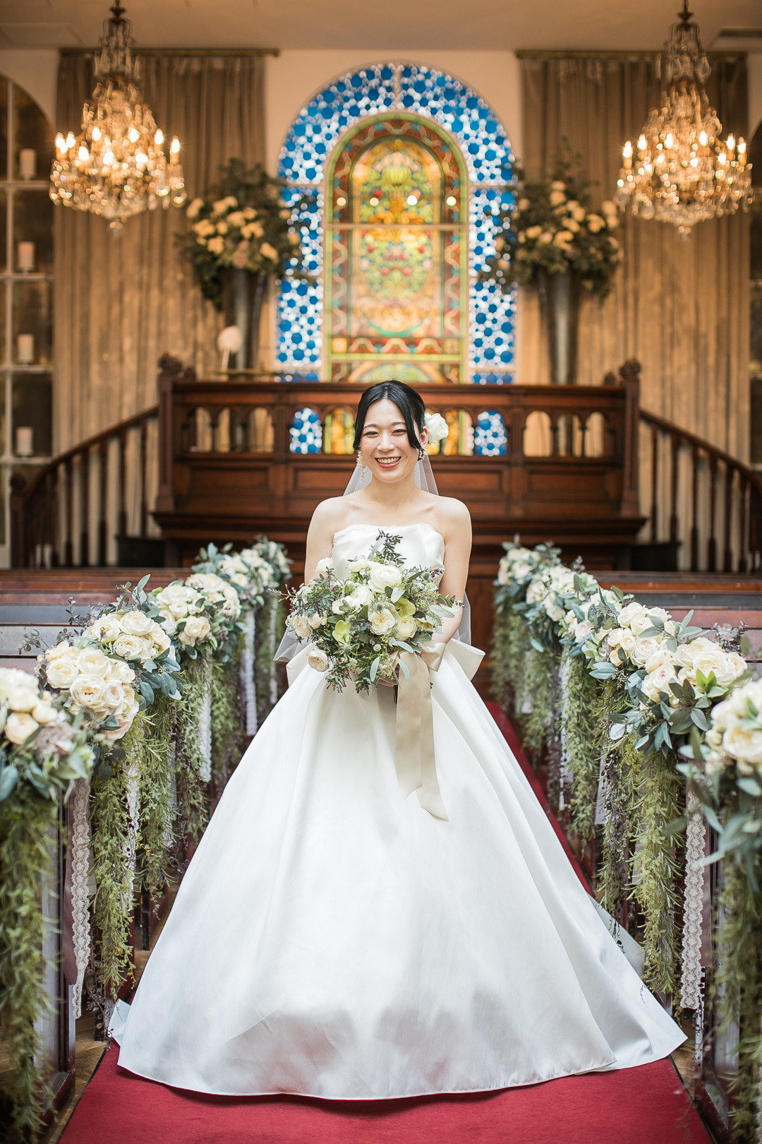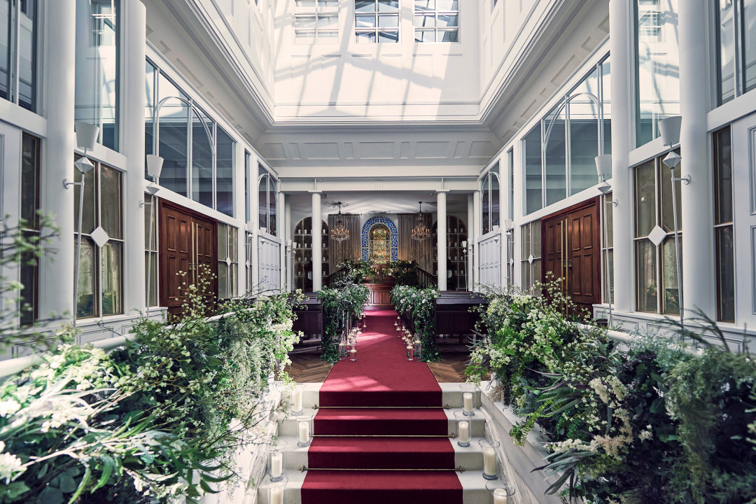 横浜で唯一現存する外国資本の銀行建築として、横浜市指定有形文化財に指定されている「ラ・バンク・ド・ロア」。約100年前の姿を守り継ぐ大理石の大階段は深紅のバージンロードに。年月を重ねたステンドグラスの輝きと、アンティークオルゴールの豊かな音色が調和する「音の教会」で感動的なセレモニーが叶います。